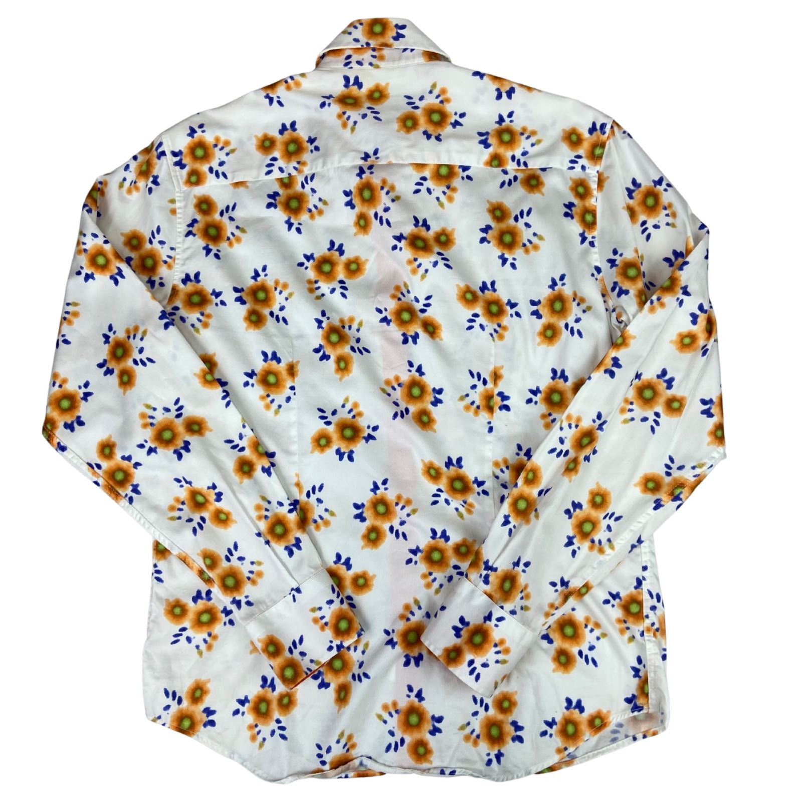 The main features include; a classic collar, a full length frontal button up, dual button up cuffs, darts along the front and back and overall orange floral with blue leaves pattern
