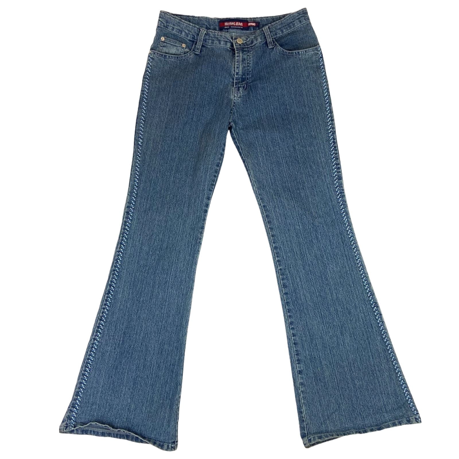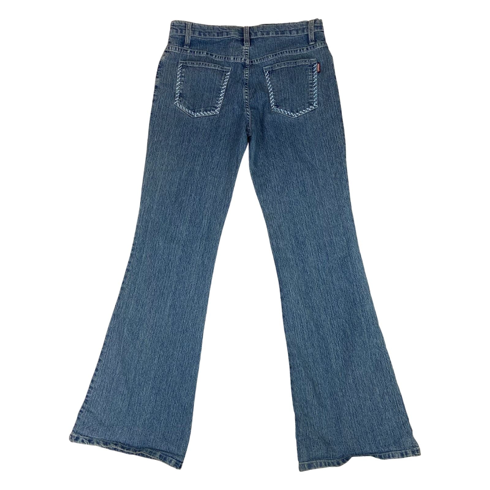 Vintage 90s Y2K Blue Washed Denim Embroidered Flared Mid Rise Jeans 12 14 M