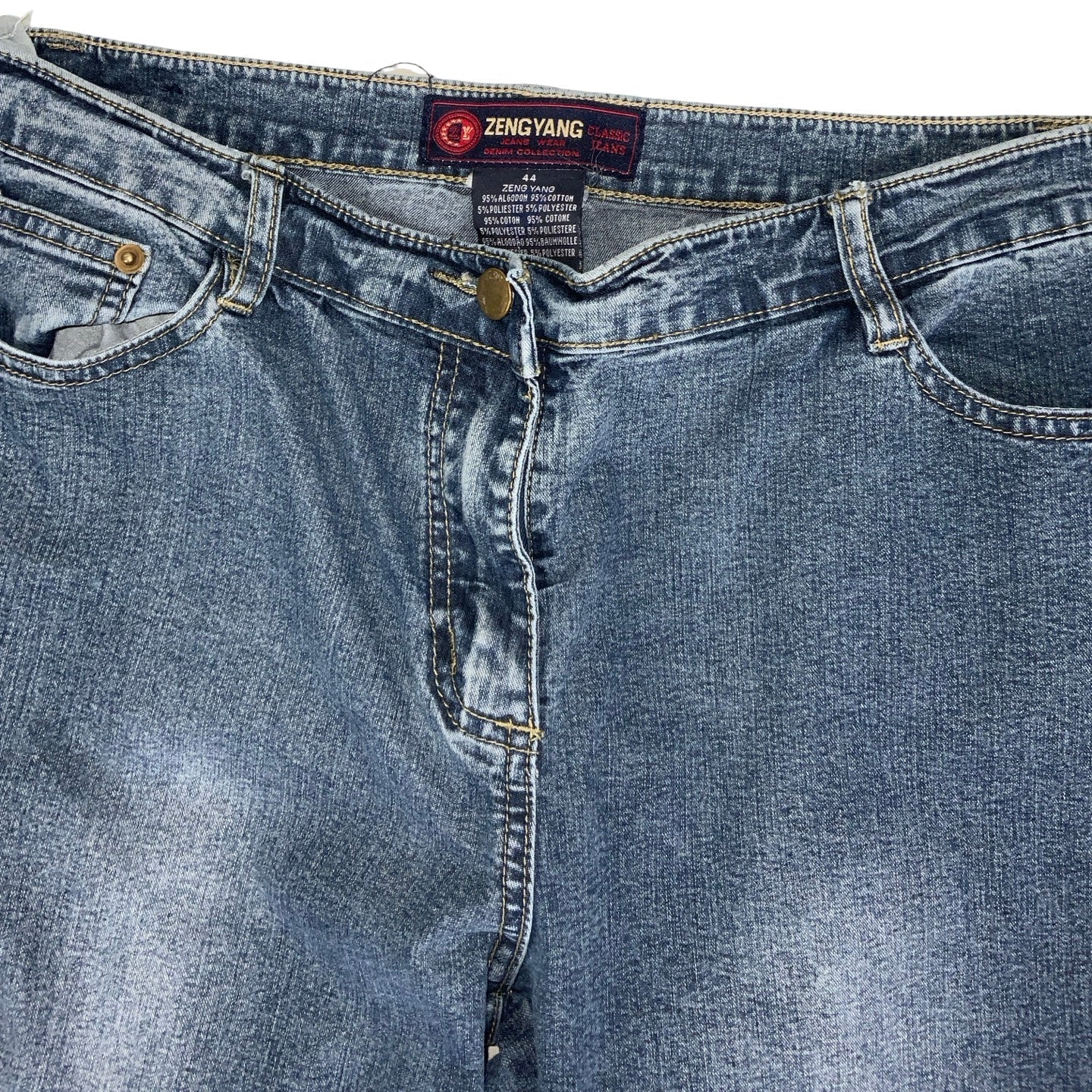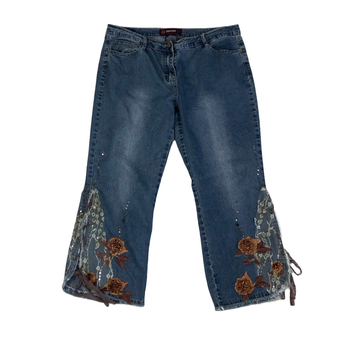 Vintage 1990s Zeng Yang 3/4 jeans with floral lace detail, fly fastening, side and pub pockets.