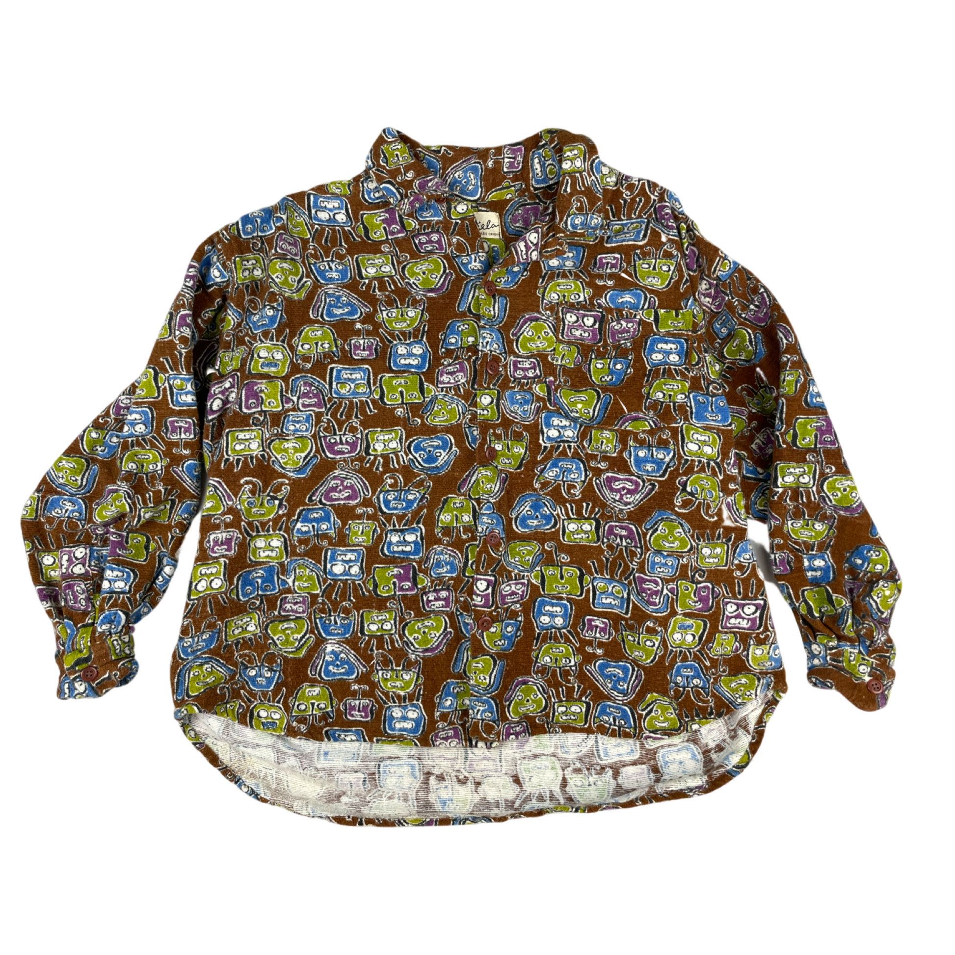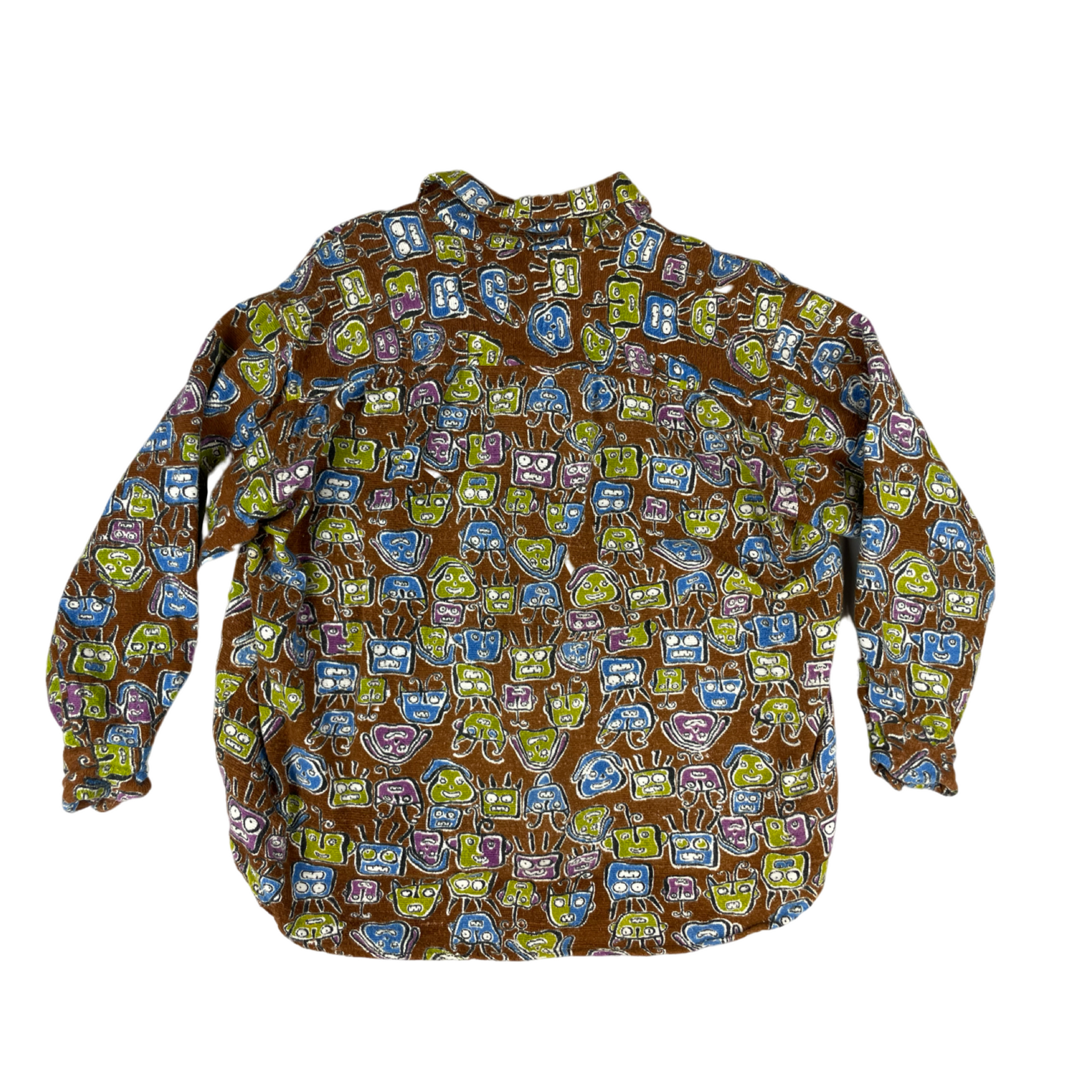 Vintage Abstract Face Pattern Printed Brown Heavy Flannel Shirt XL