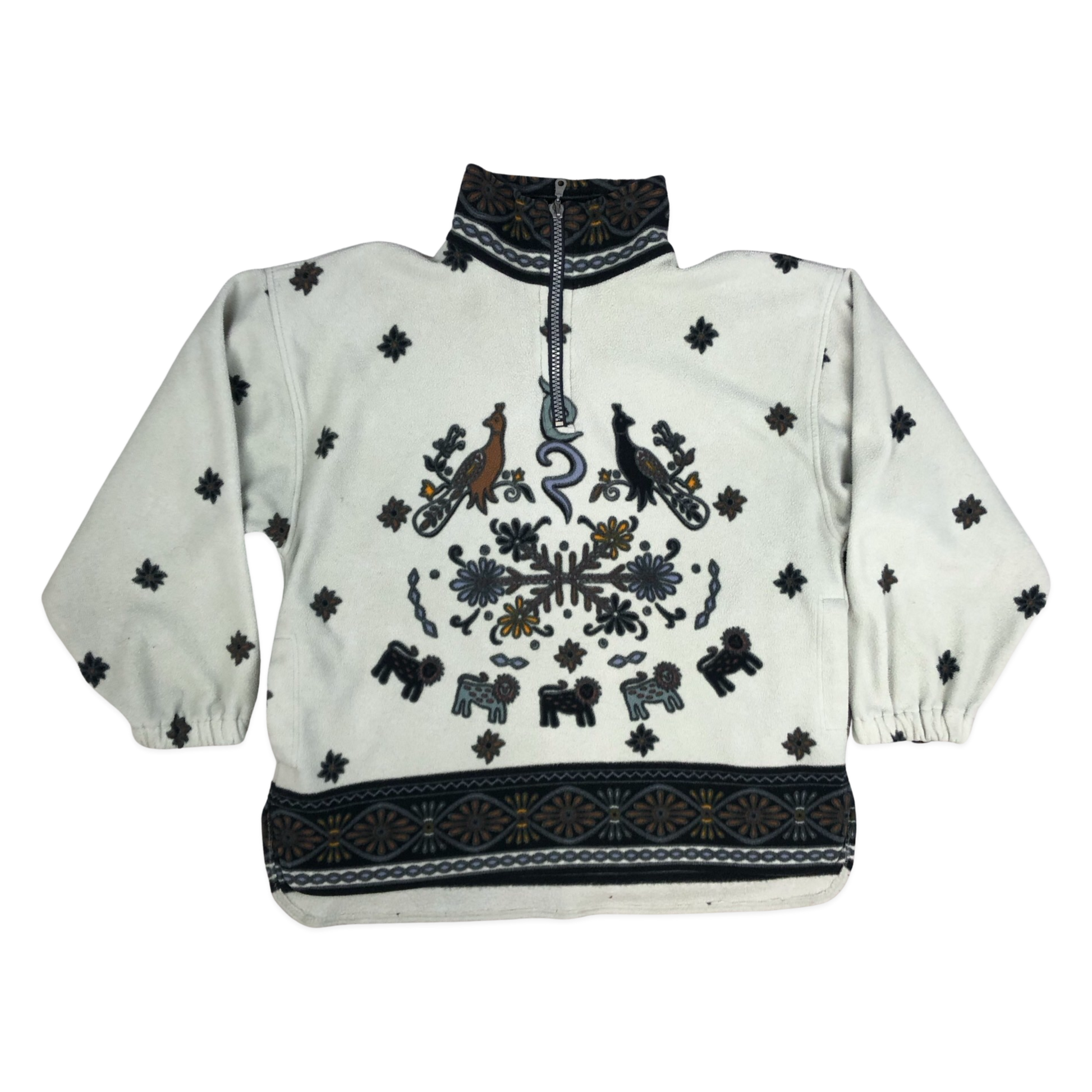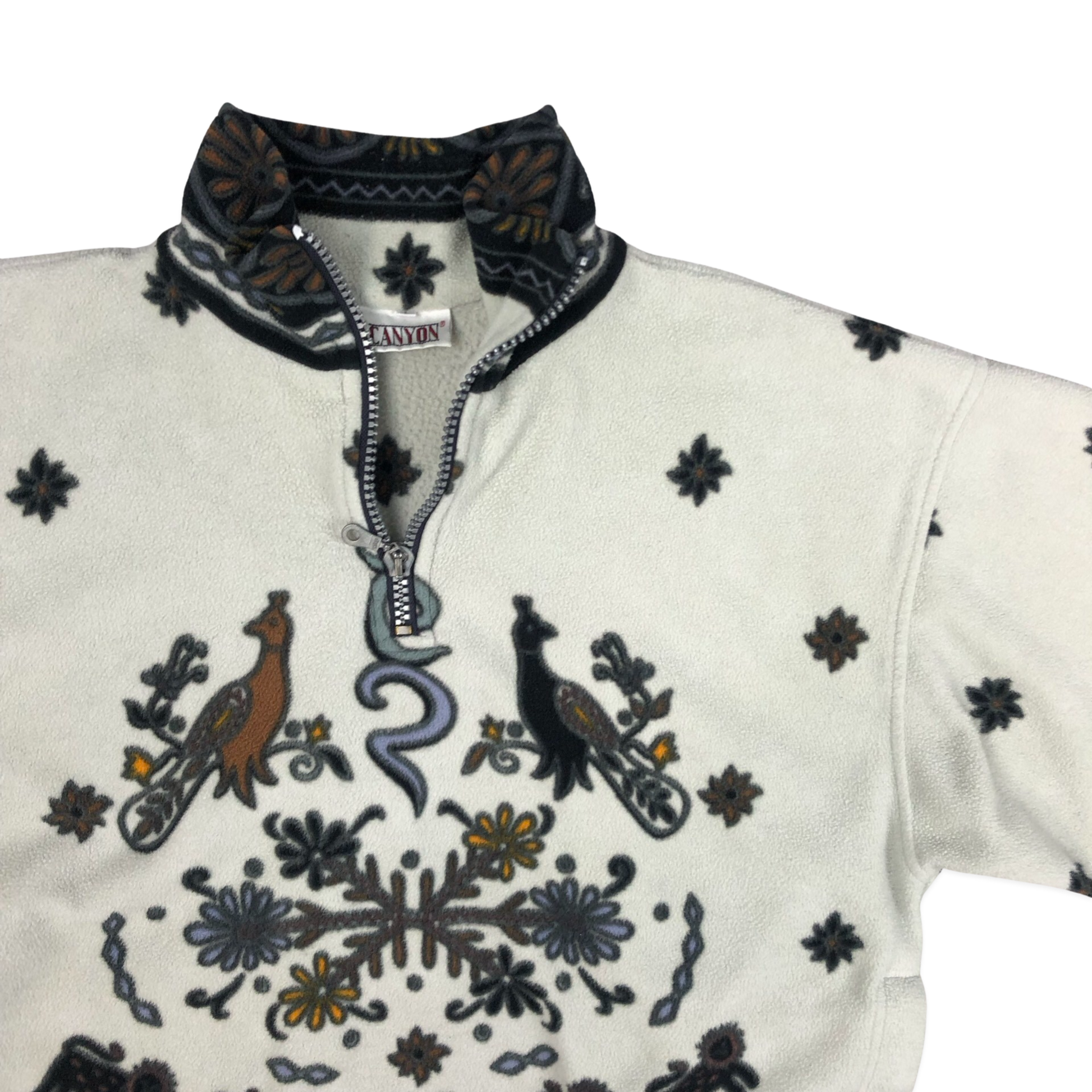 Vintage 1/4-zip fleece pullover with abstract print and side pockets.