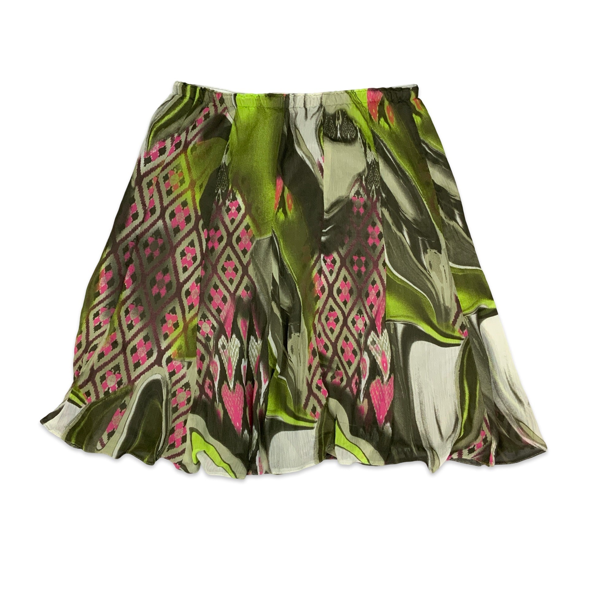 Women's vintage midi skirt. Green & pink abstract print on mesh fabric with grey lining and elasticated waist.