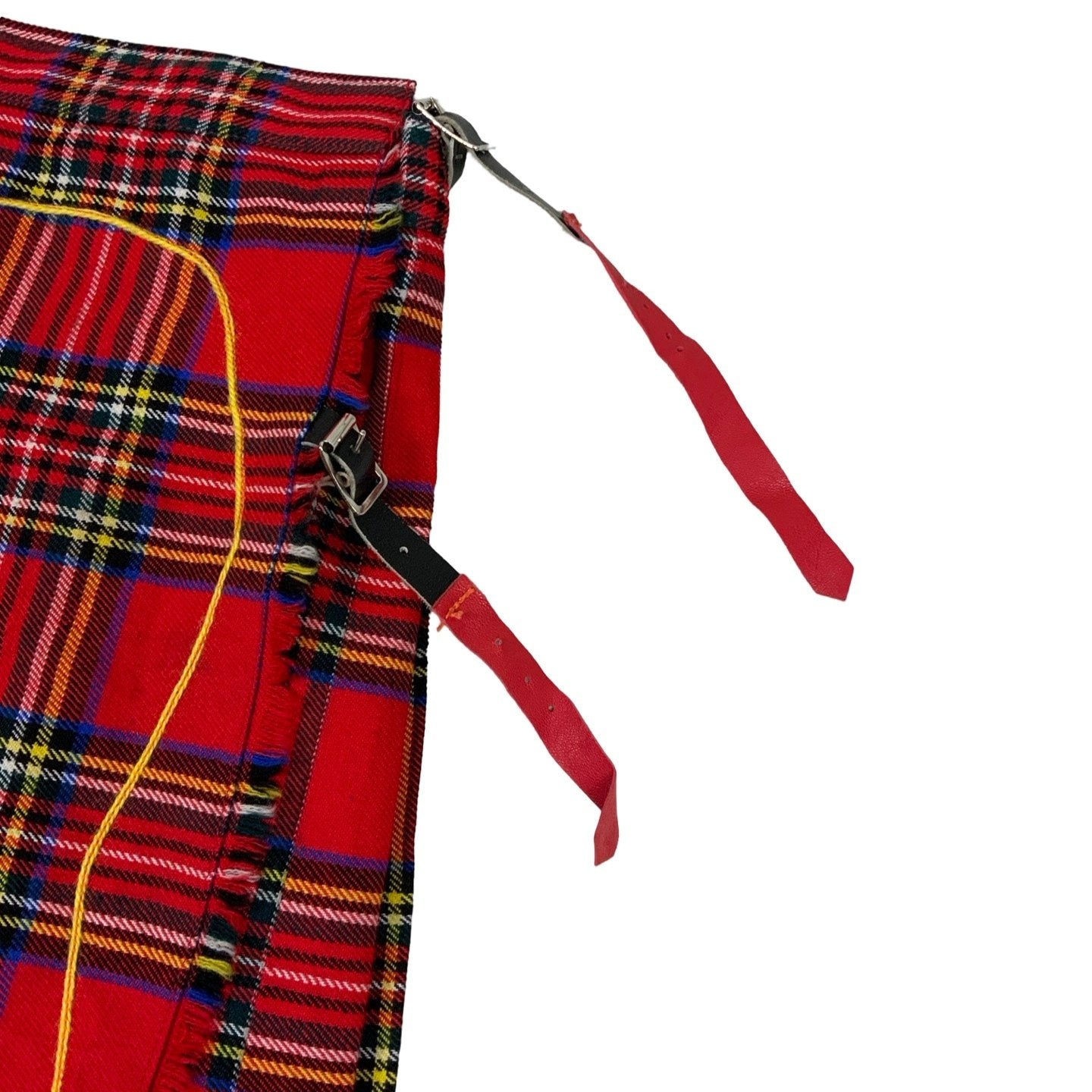 Vintage traditional unisex Scottish kilt in red, blue, yellow, white ad black tartan. 'Anytime, Baby..!' patch on front with yellow line-work embroidery pattern. Leather adjustable buckle fastening, and sewn on extenders. Pure new wool. Dry clean only.