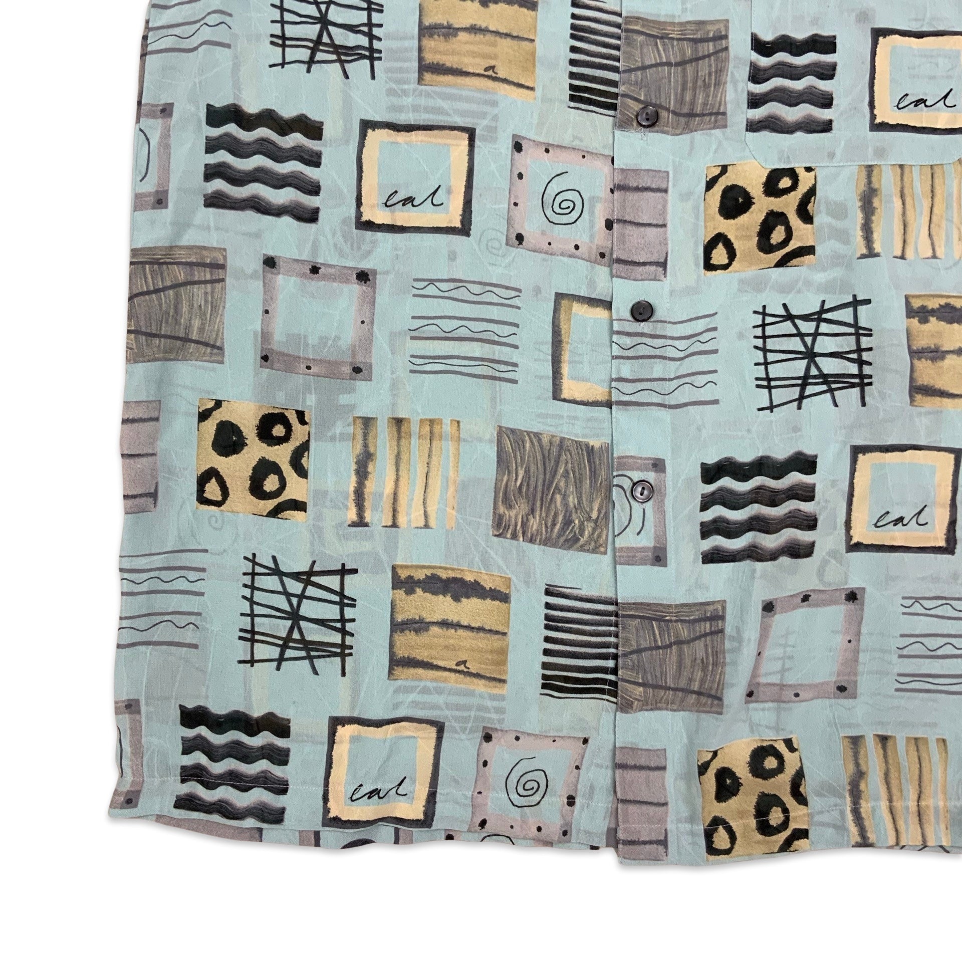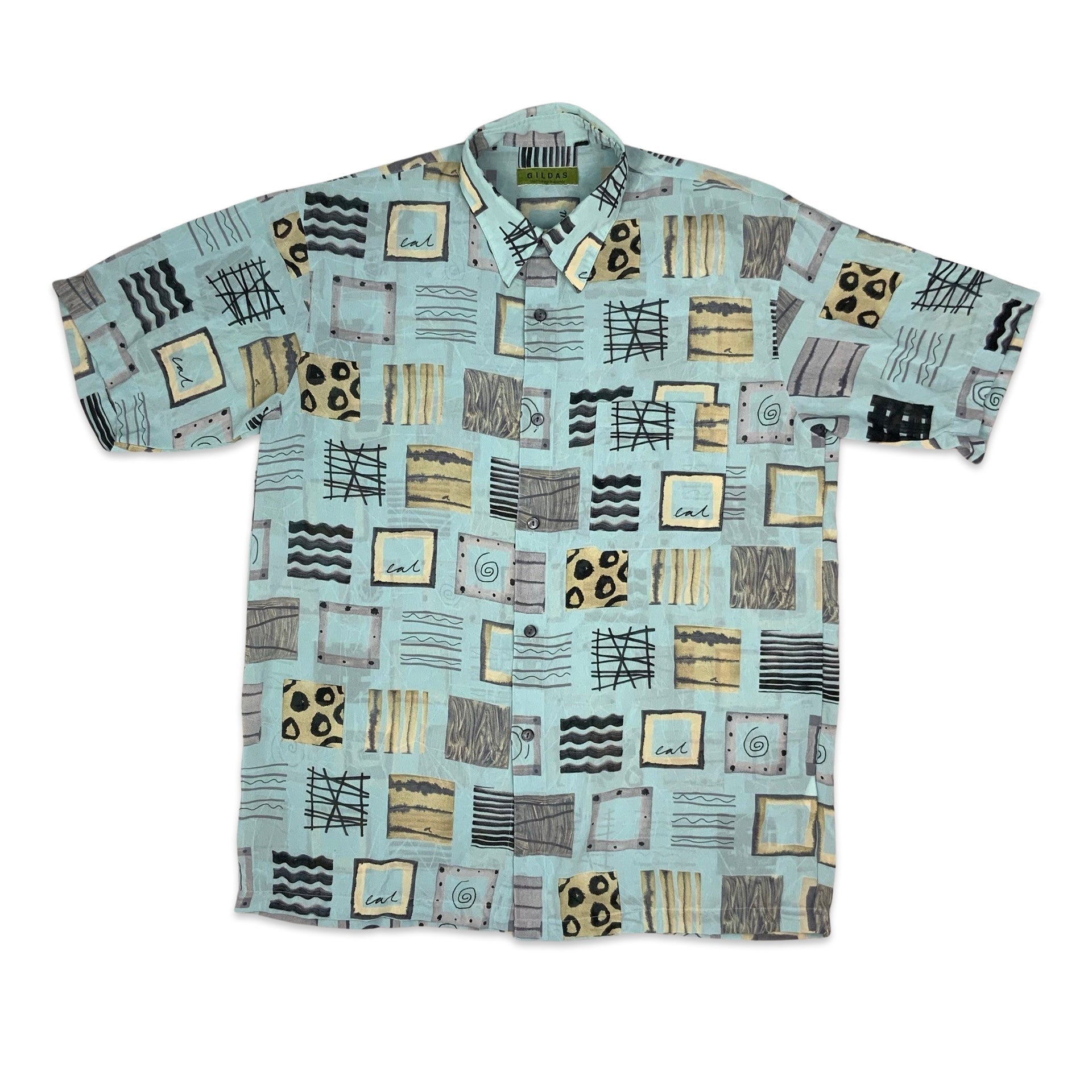 Men’s vintage short sleeve shirt. Sheer baby blue fabric with check abstract print in beige, grey & black.