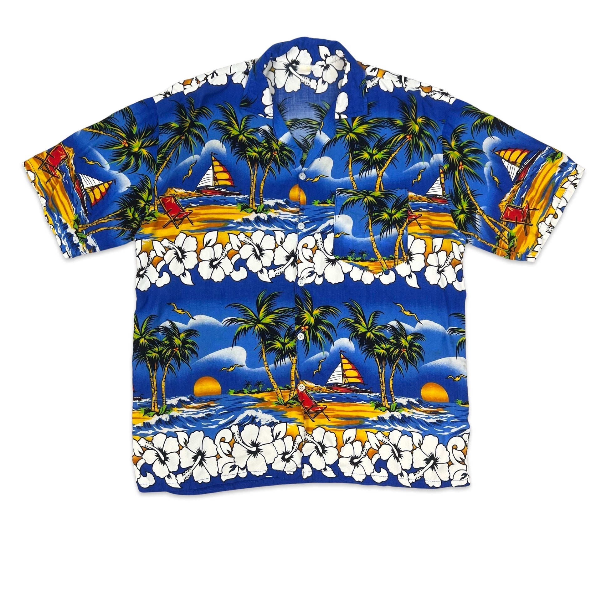Vintage Hawaiian style men's shirt with all-over beach theme print.