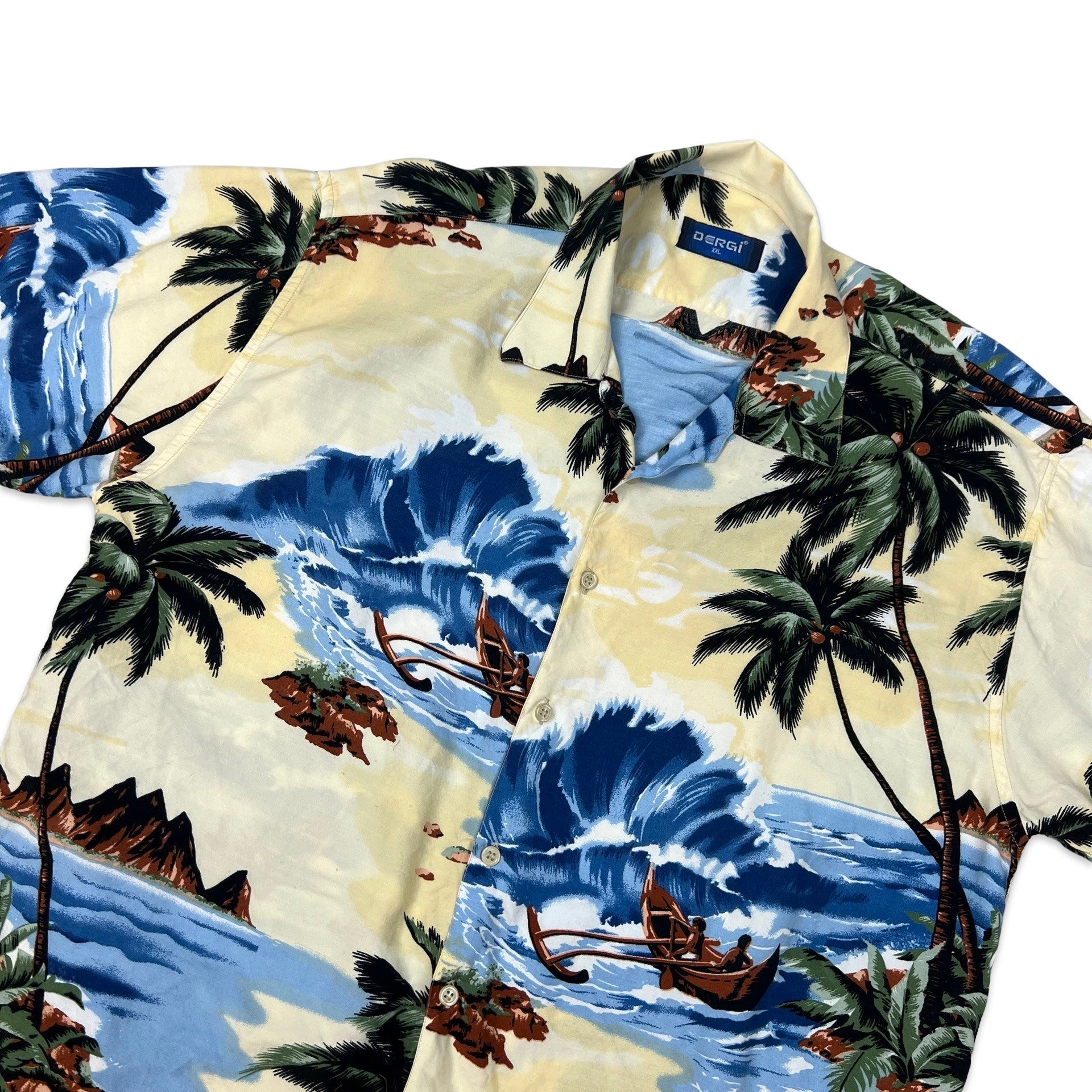 Vintage Beige Blue & Green Island Theme Print Hawaiian Shirt XL XXL
