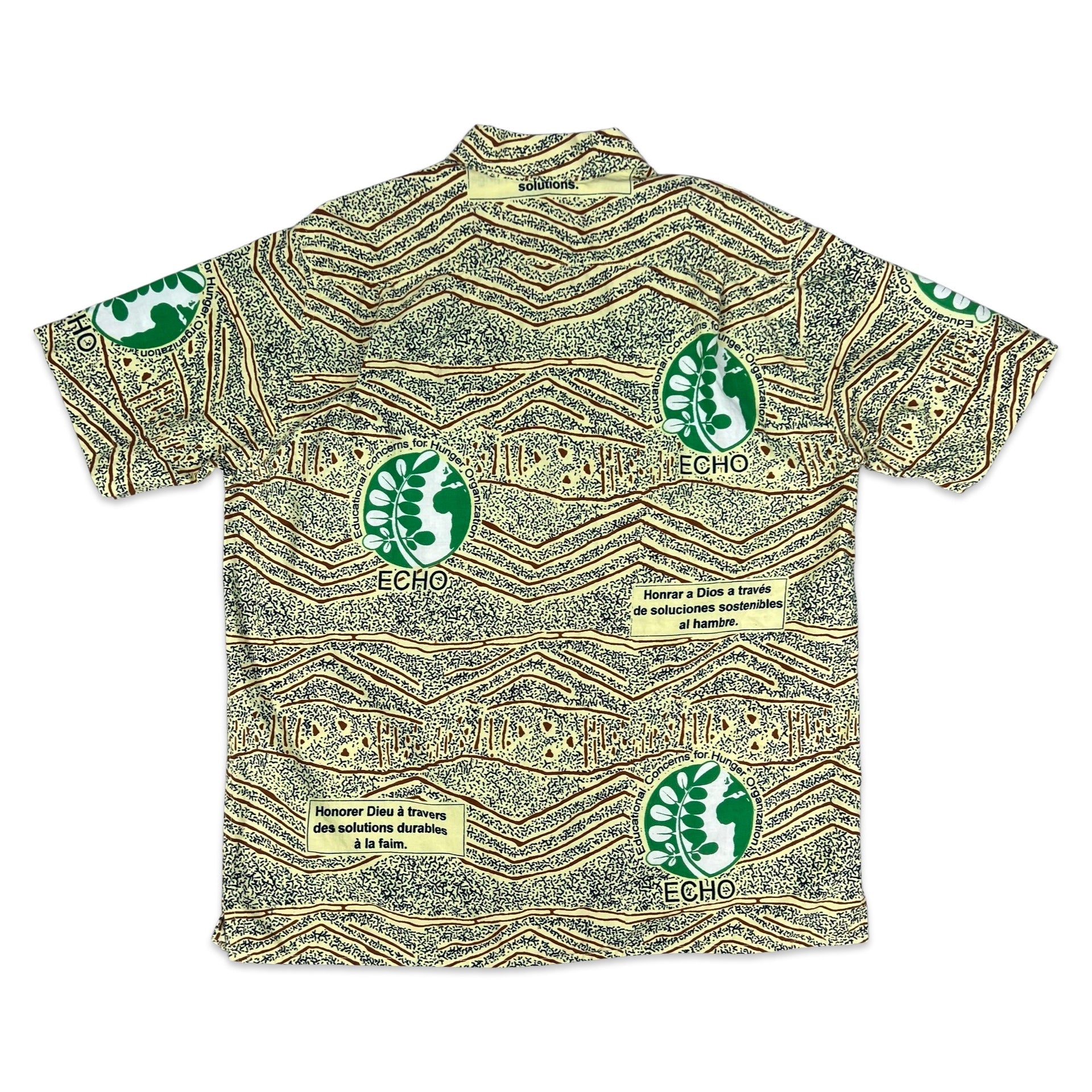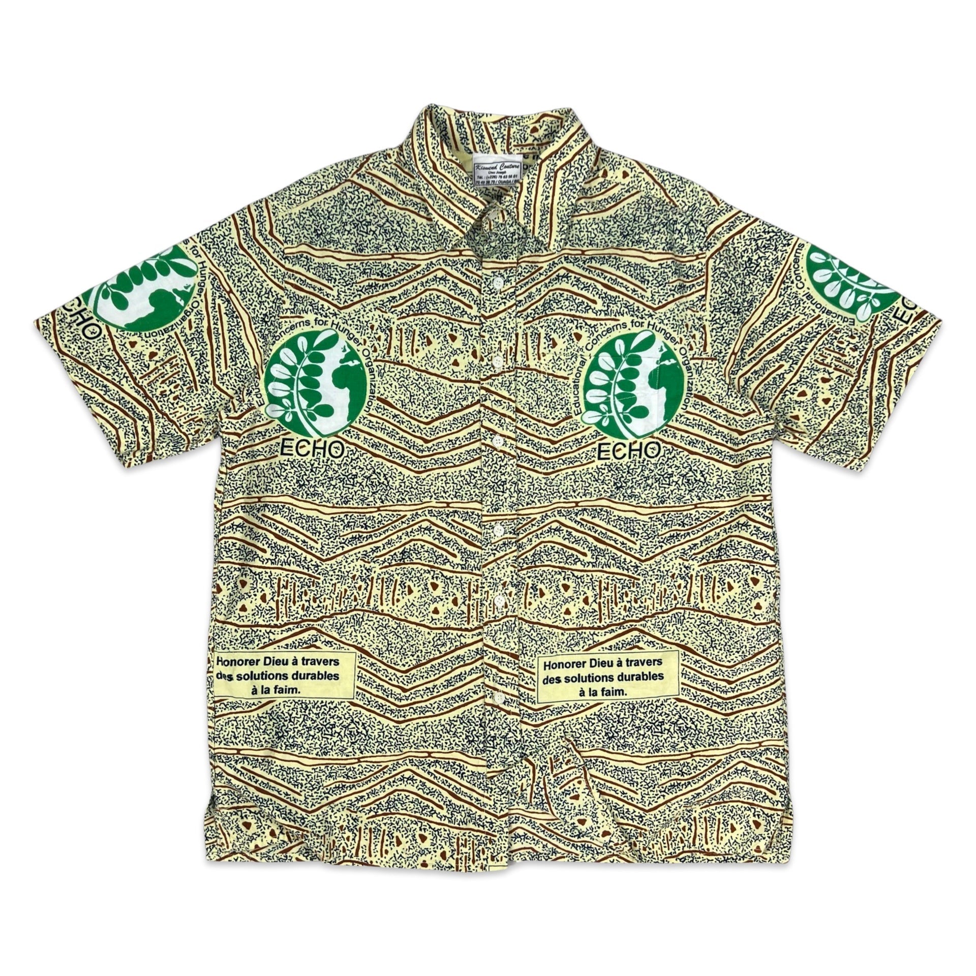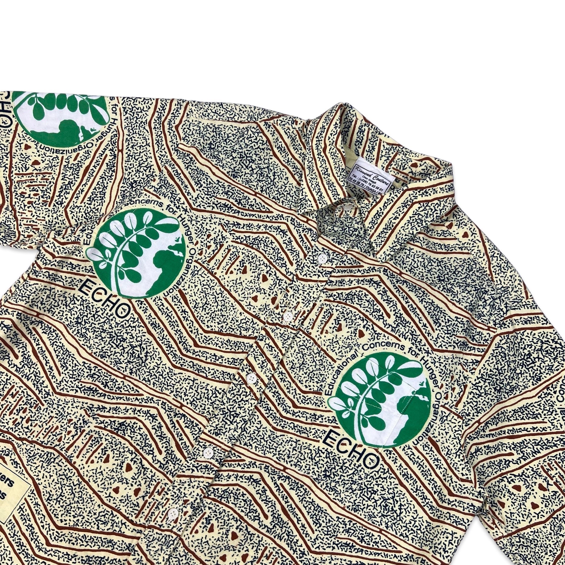 Vintage short sleeve shirt with abstract beige, brown and green print featuring the logo for the Educational Concerns for Hunger Organization and chest pocket.