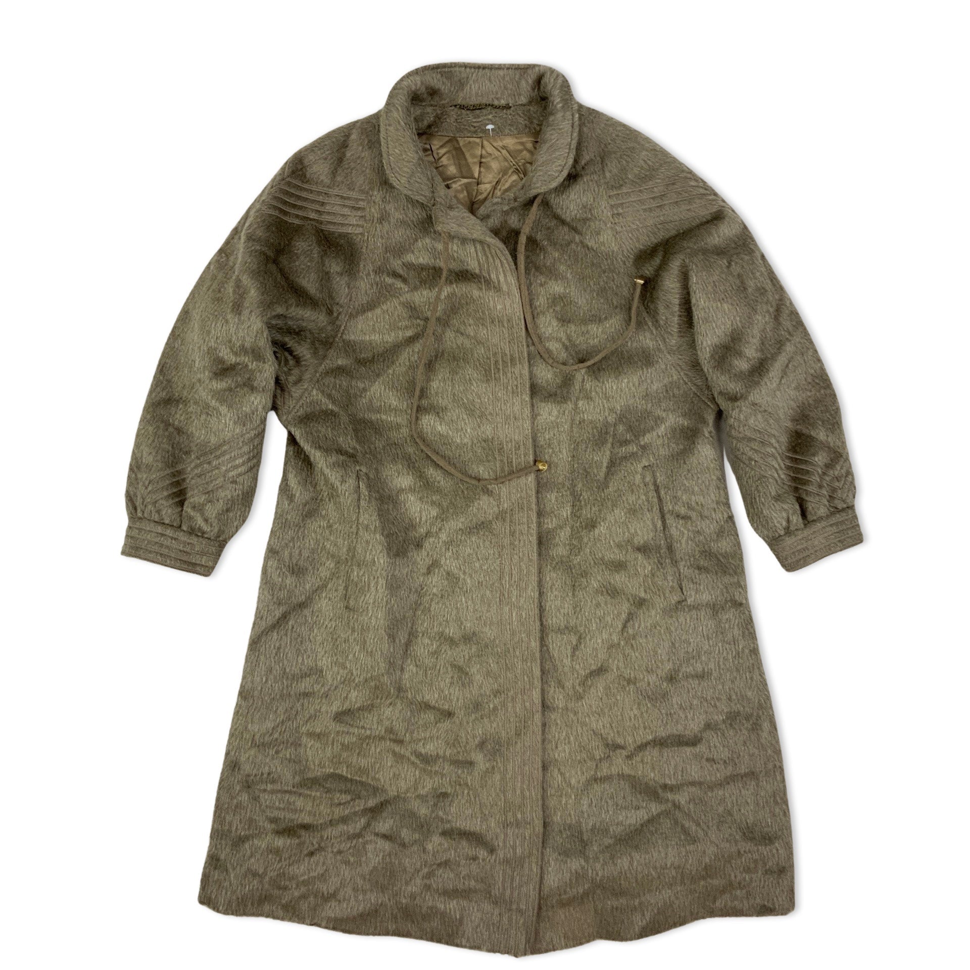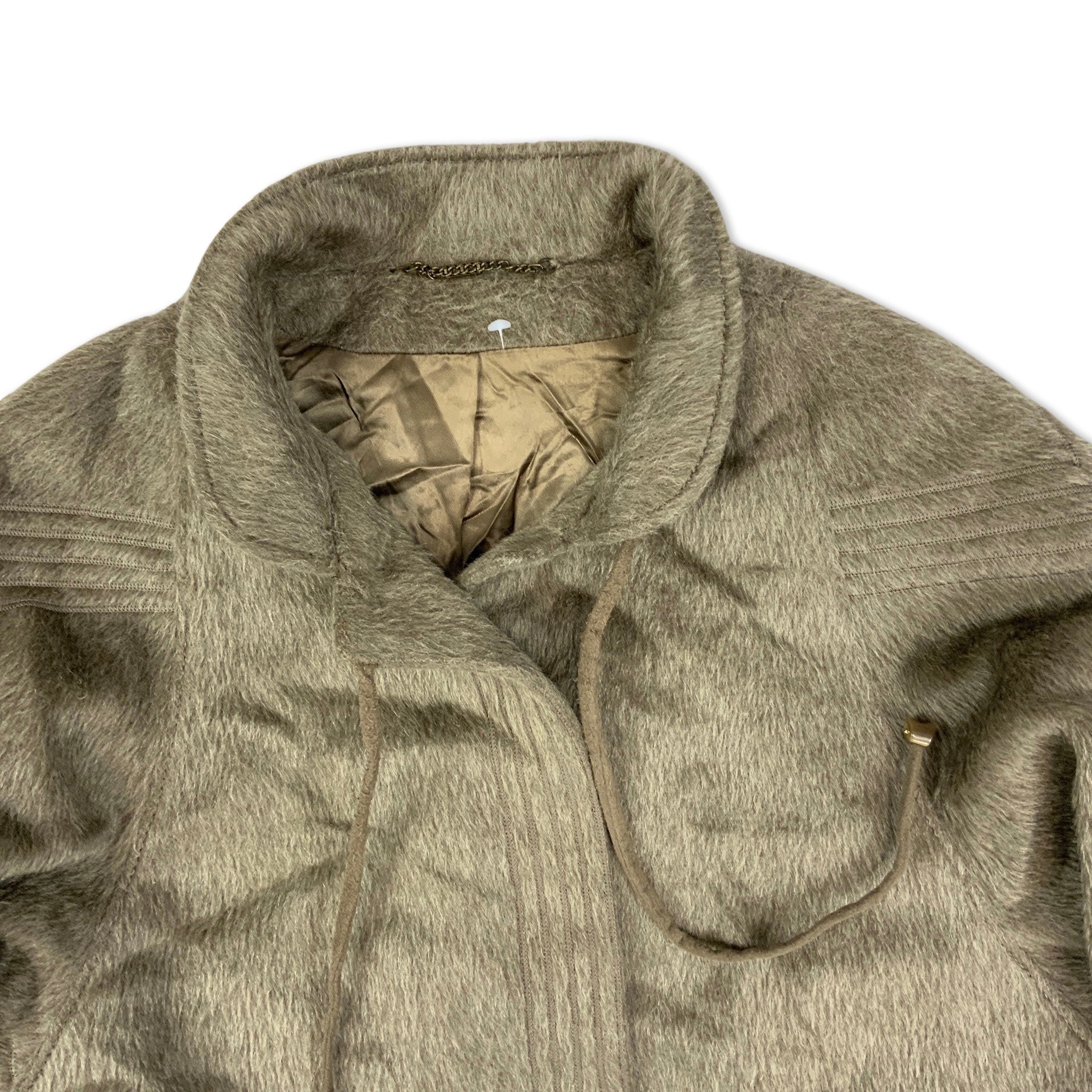 Vintage ladies beige coat in llama wool. Button up front fastening with collar tie detailing and side pockets.