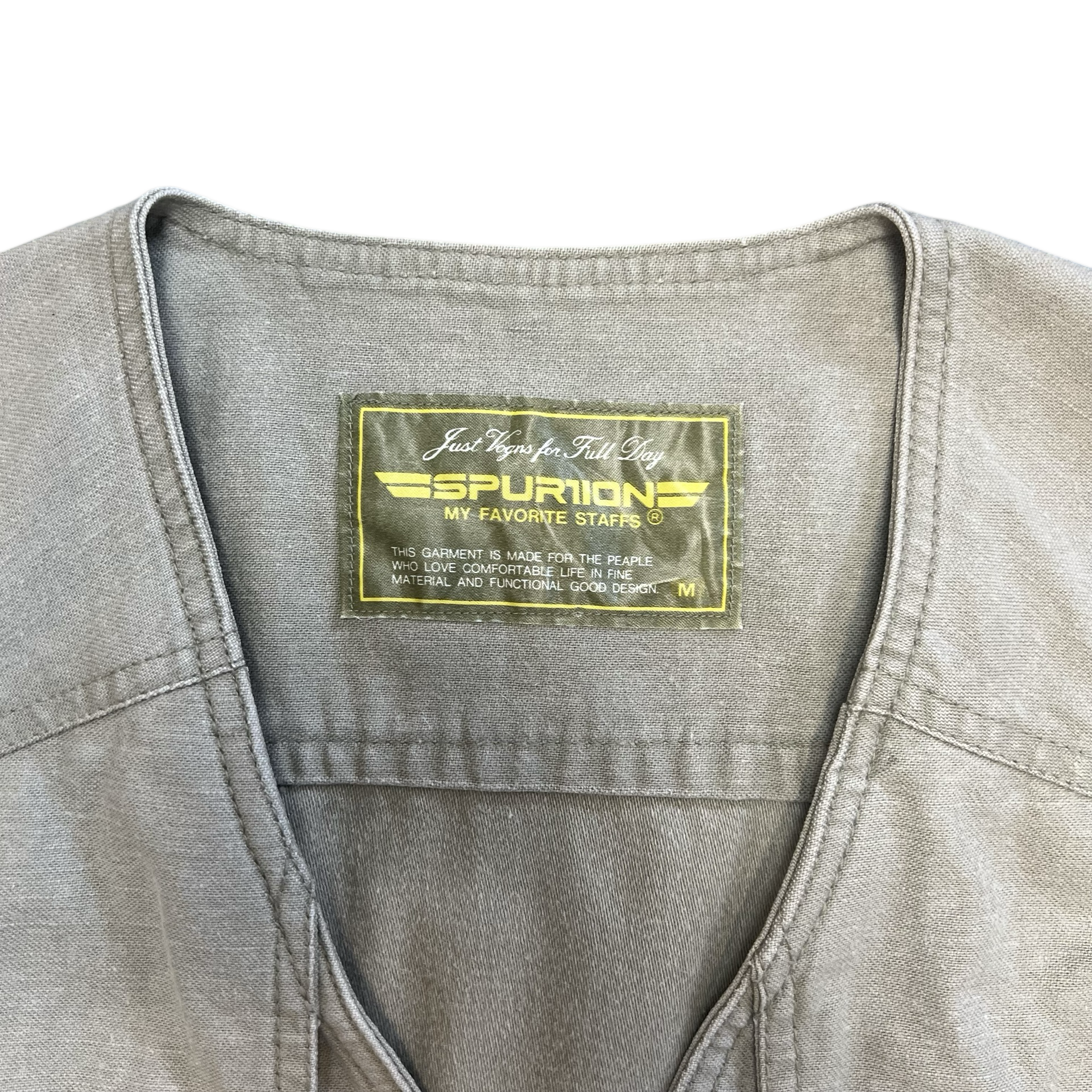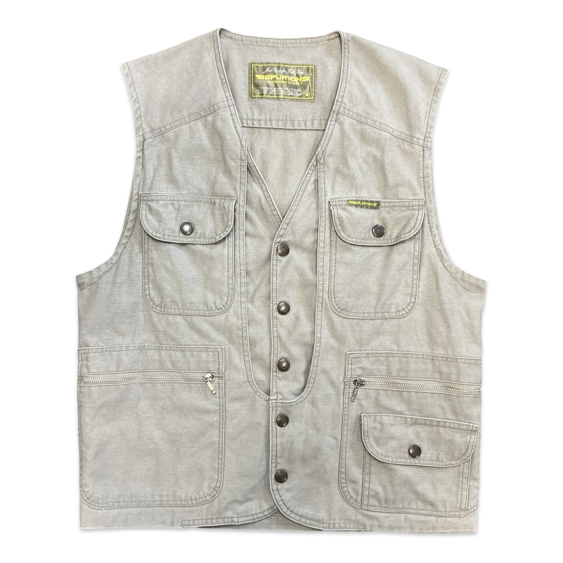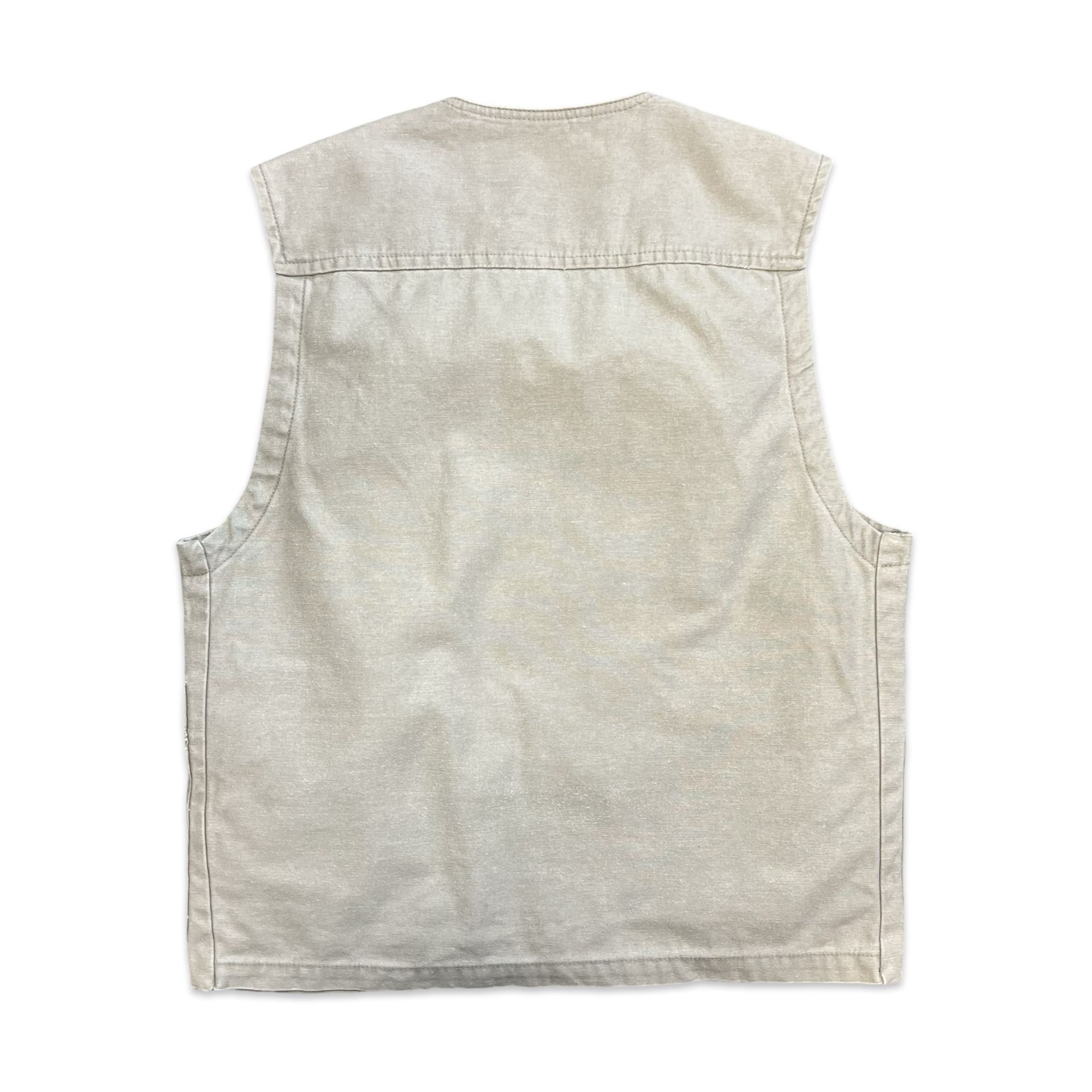 Vintage 90s utility vest in beige canvas with multiple pockets.