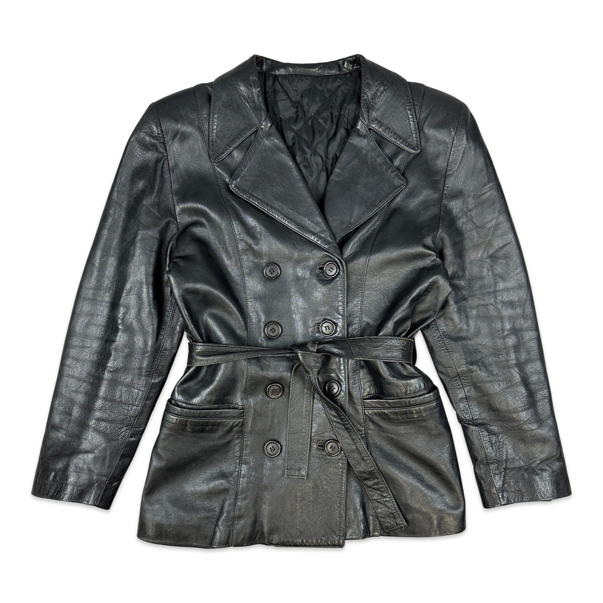 vintage ladies black belted leather coat. Double breasted button fastening on the front, light signs of natural wear as you can expect from vintage leather.