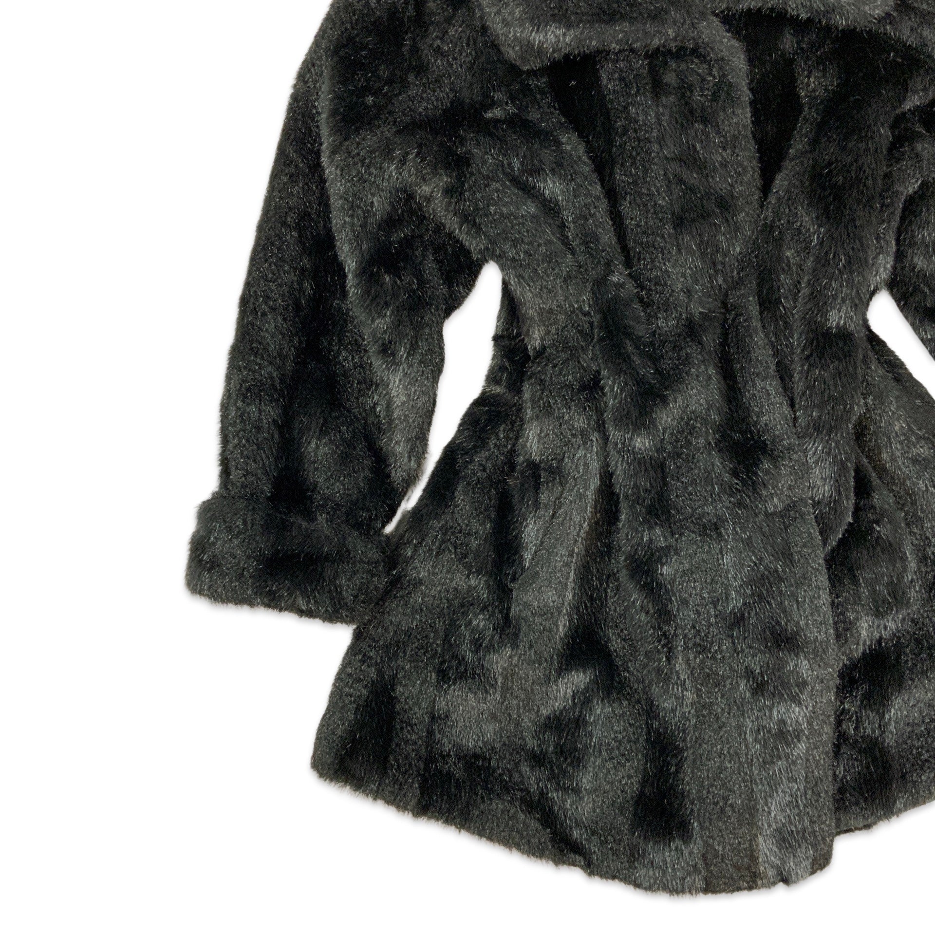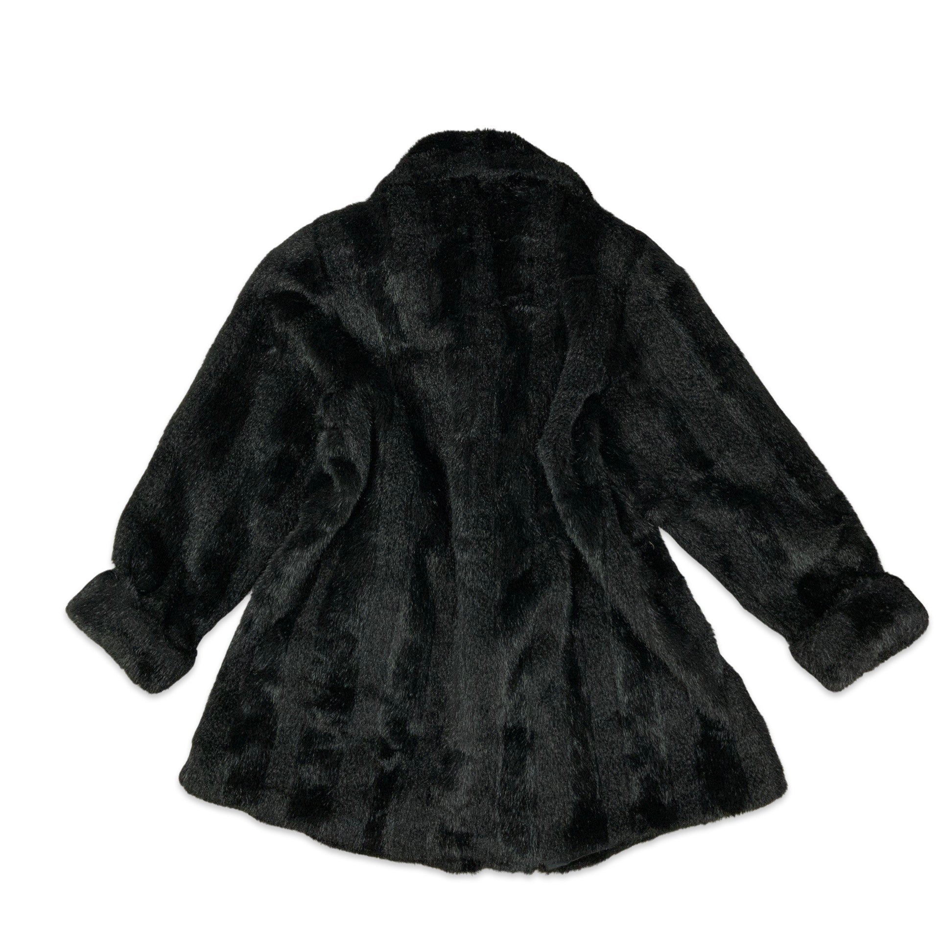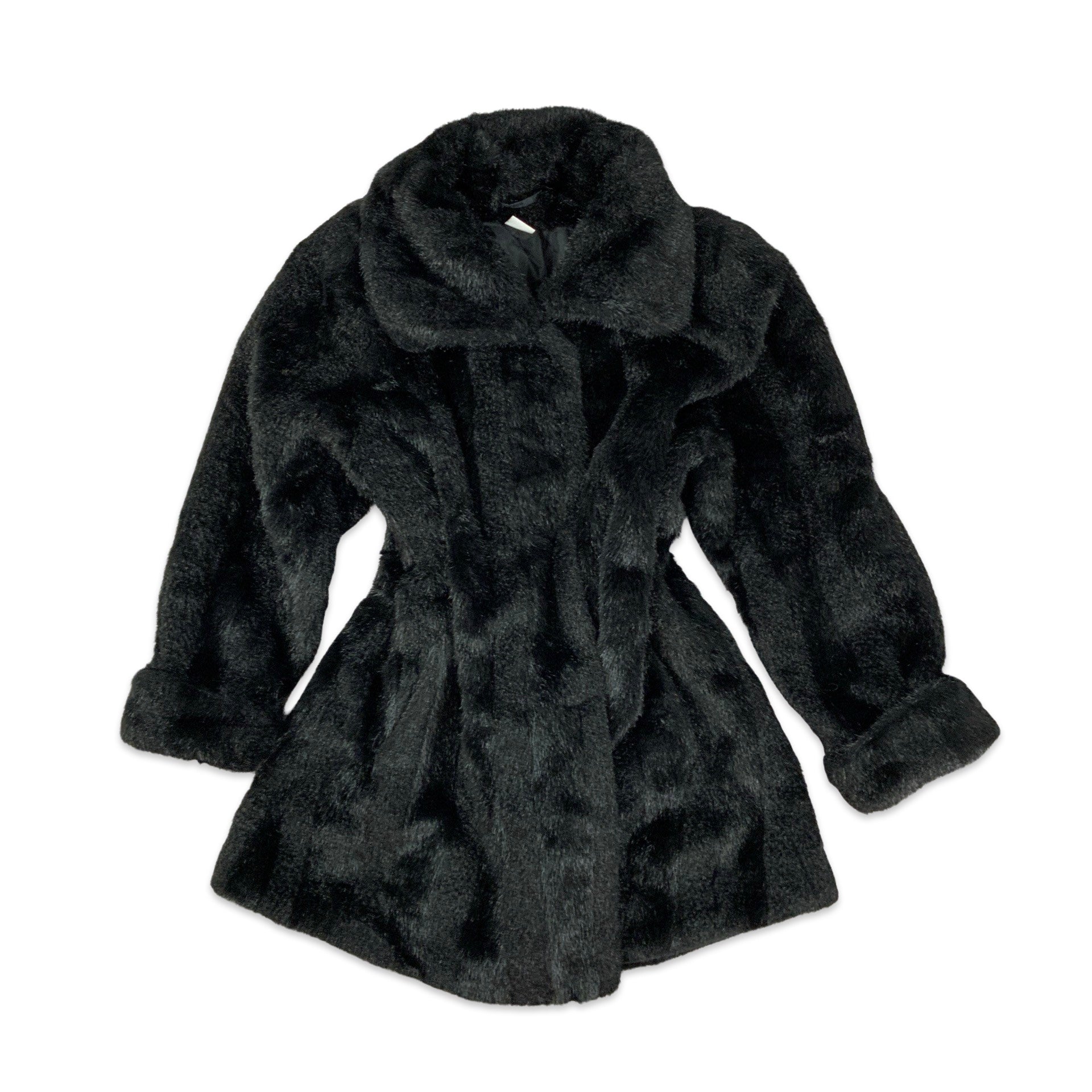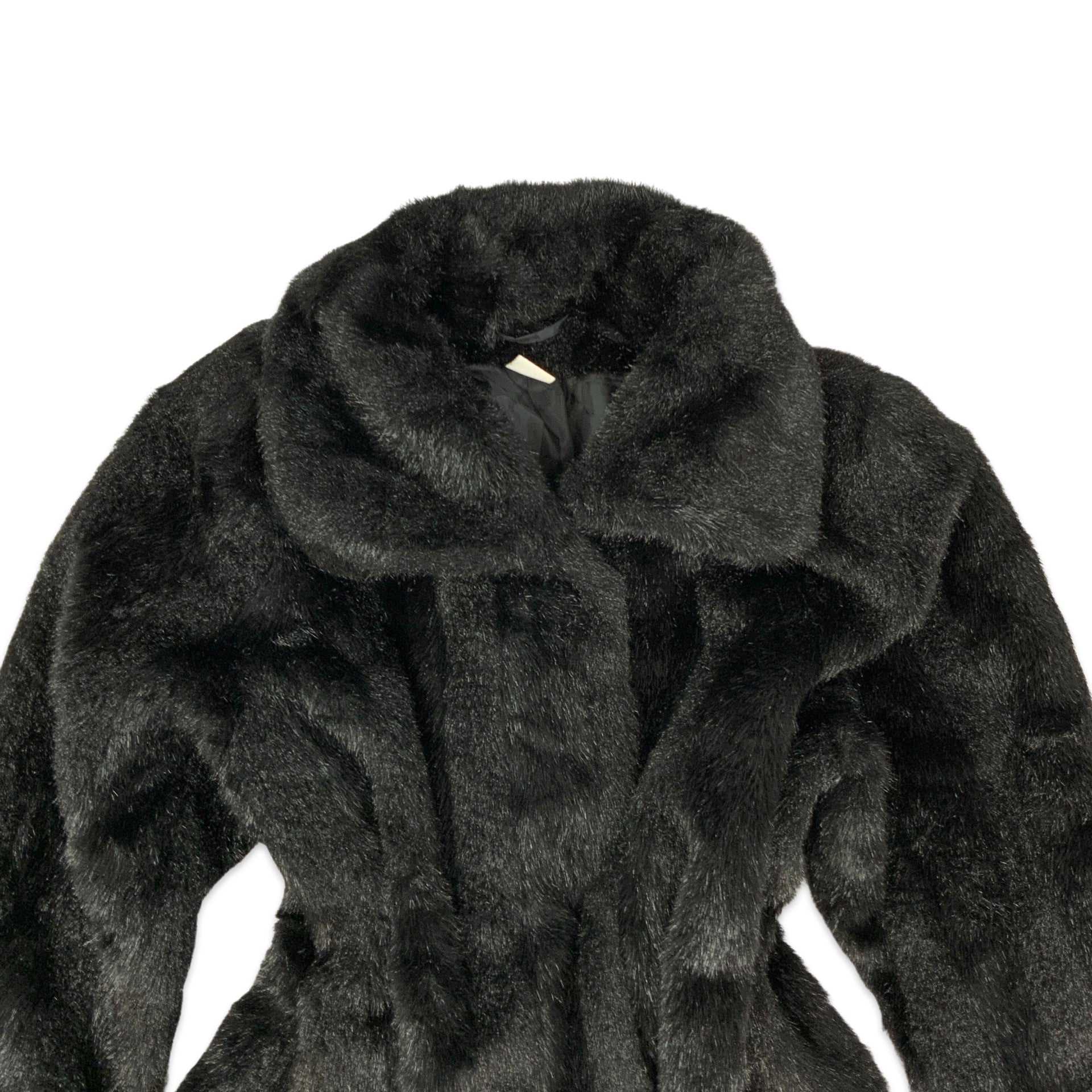 Vintage striped thick faux fur midi coat in black. Thick collar and cuffs. Clasp fastening, fully lined, pockets.