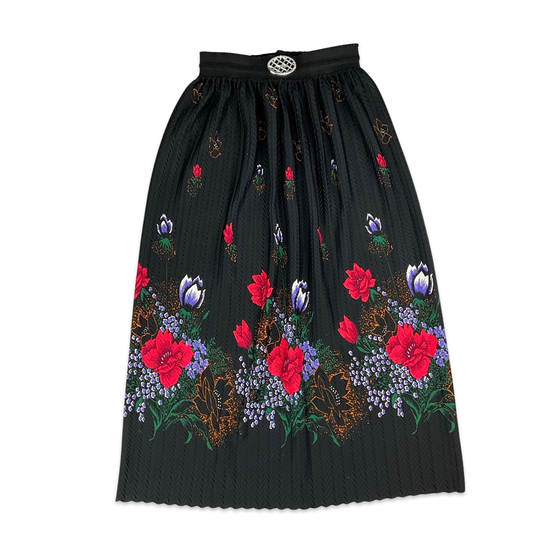 Women’s vintage maxi skirt. Black textured fabric with purple & red floral design. Elasticated waist with silver detachable broach.