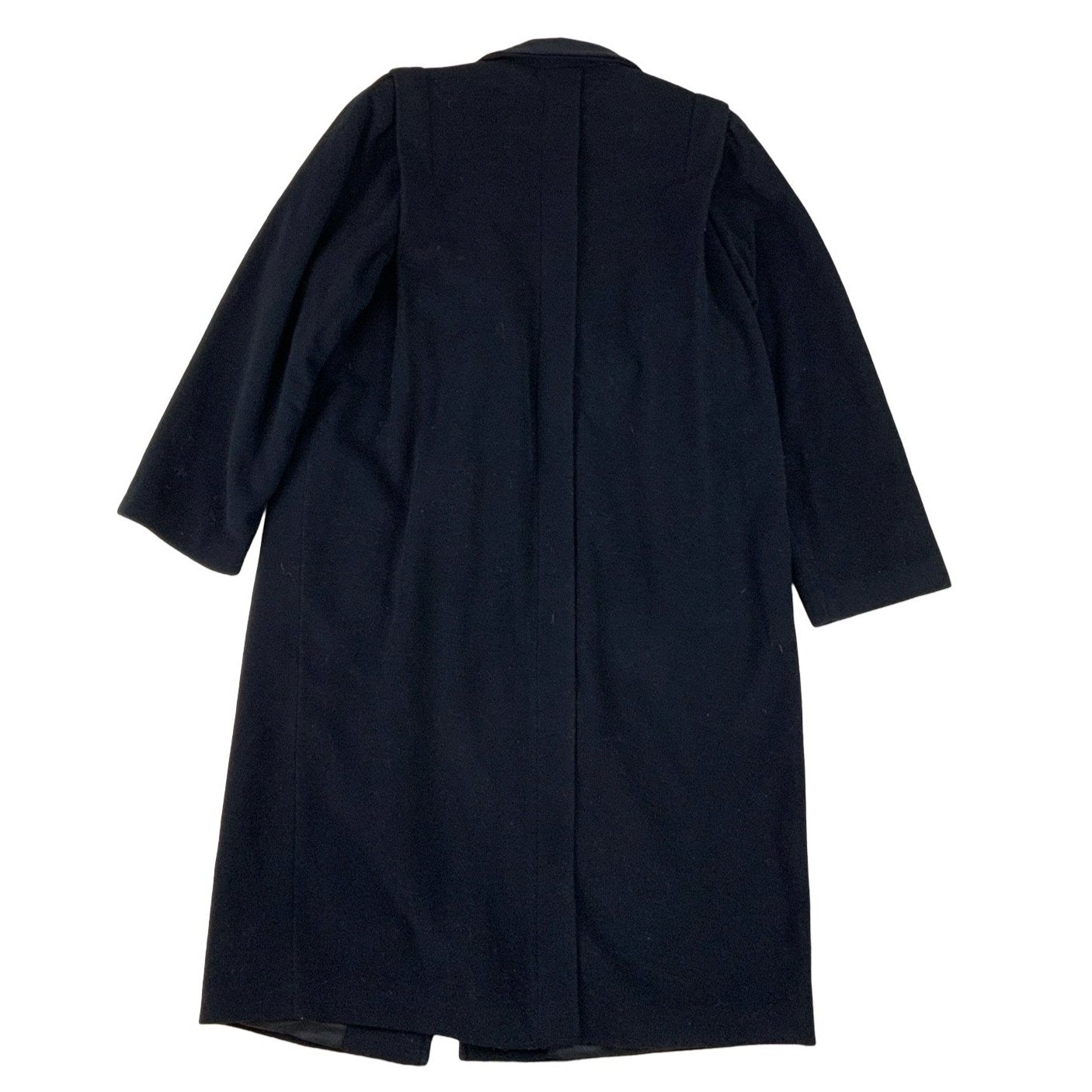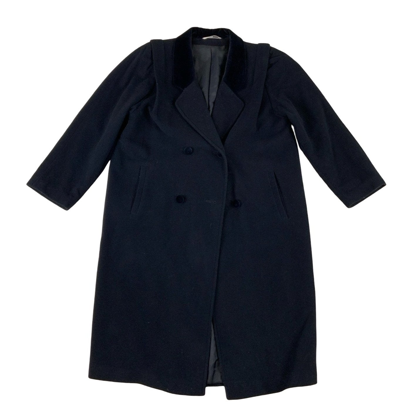 Vintage black trench coat. Featuring Pleat detailing on the back and front of jacket, Valour/velvet collar two font pockets in black. front button up fastening. 100% wool.