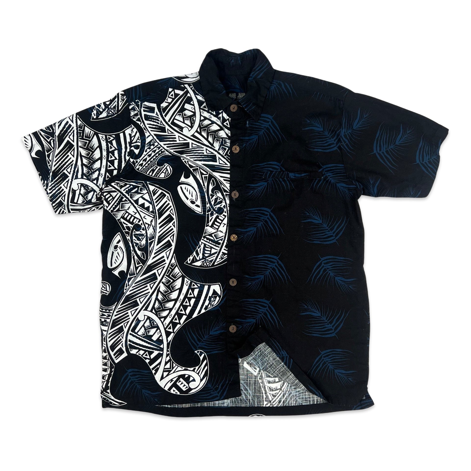 Vintage Y2K abstract print black and white Hawaiian style shirt with wooden buttons.