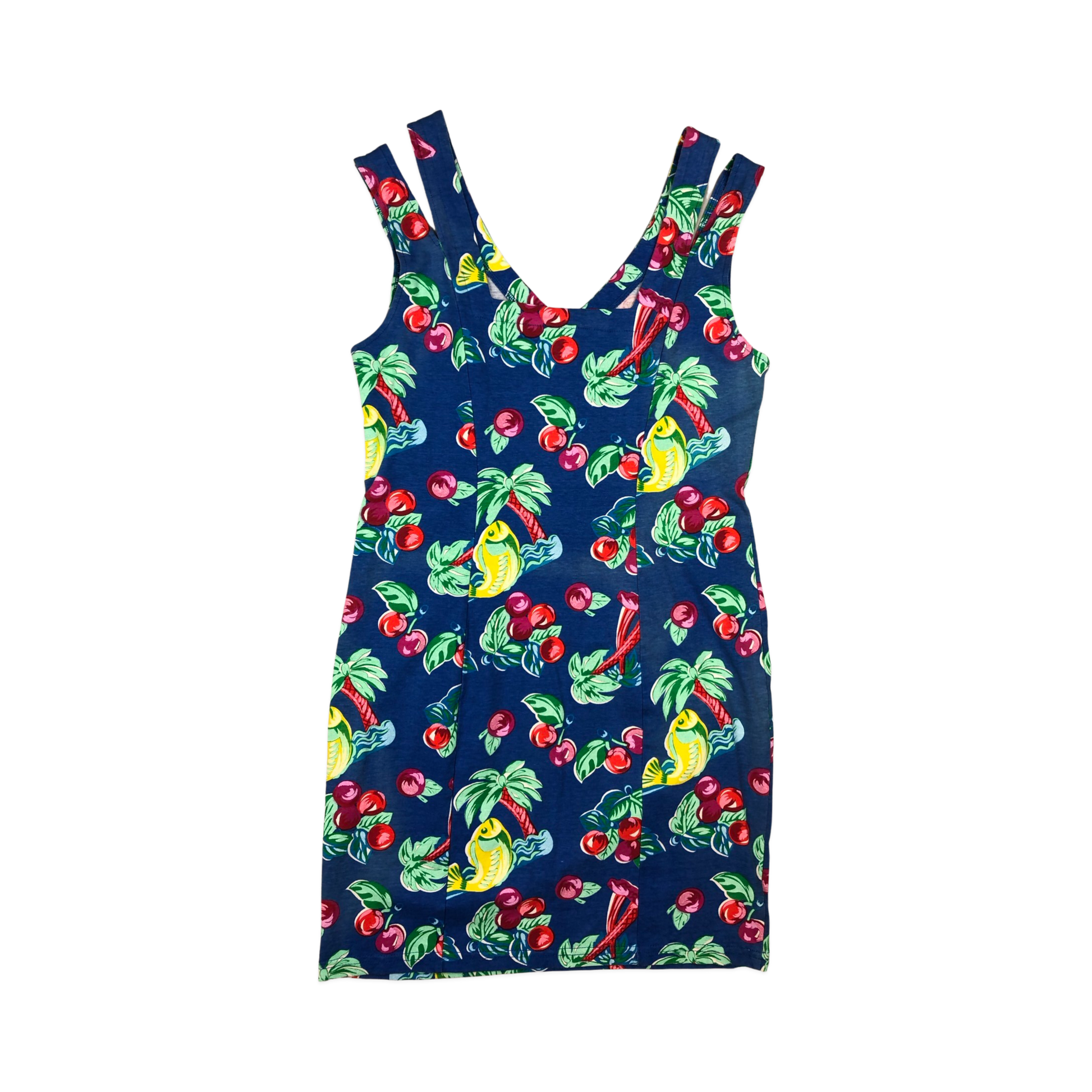 Sleeveless dress with beach themed graphic print and double shoulder straps.