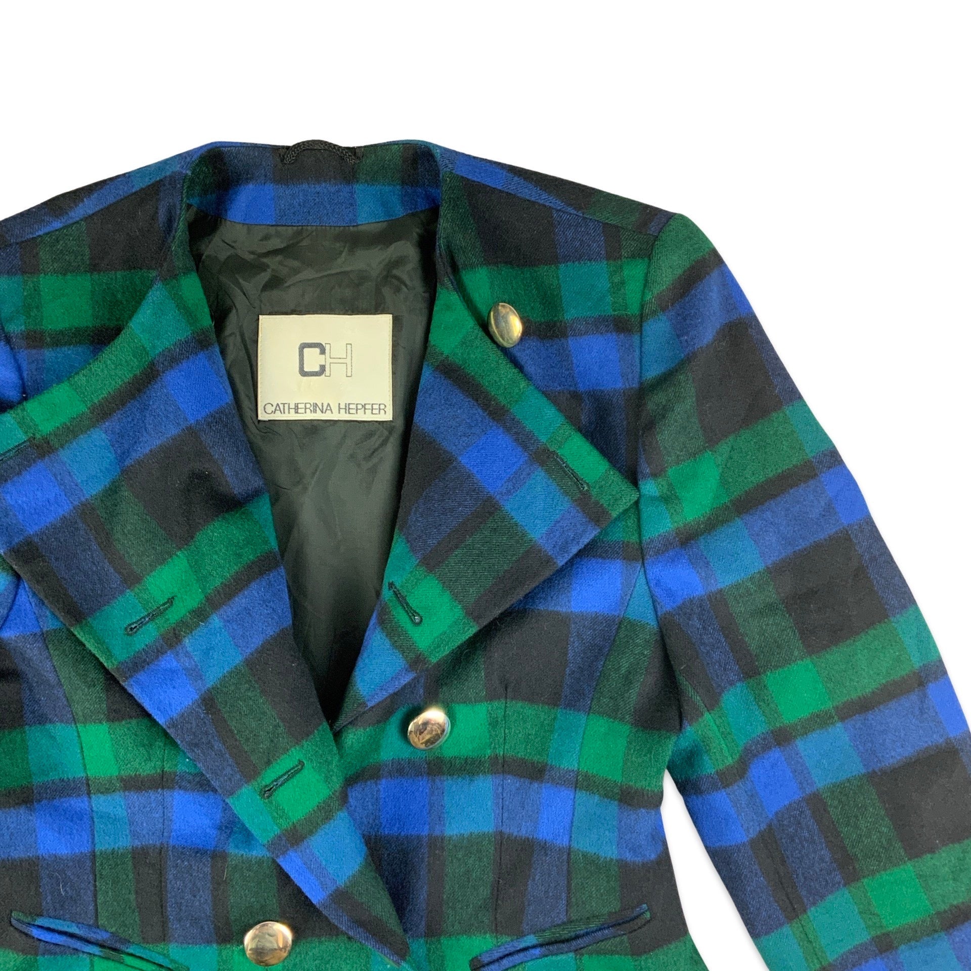 Vintage blue, black, and green plaid double breasted women's wool coat.
