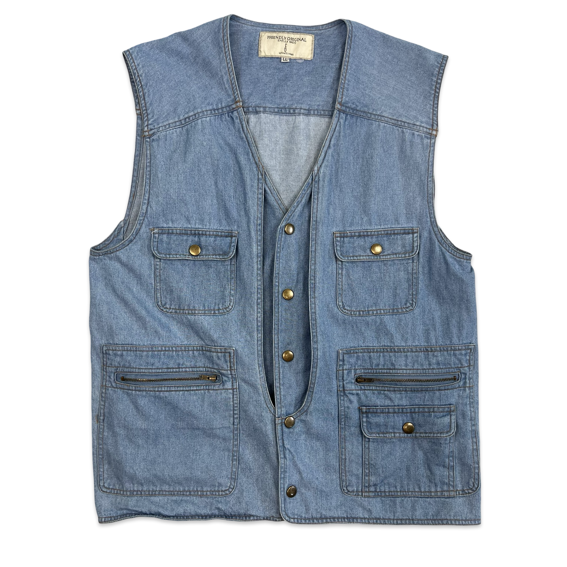 Vintage 90s blue denim waistcoat gilet with multiple utility pockets.