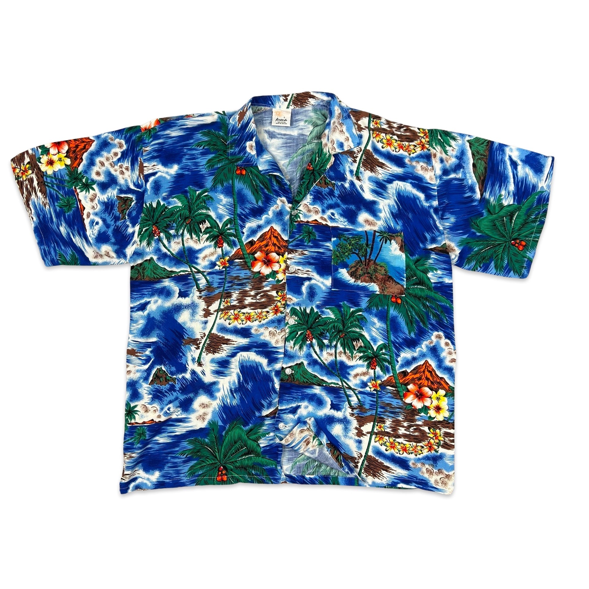Vintage lightweight Hawaiian style shirt with all-over island print in blue, green, and orange.