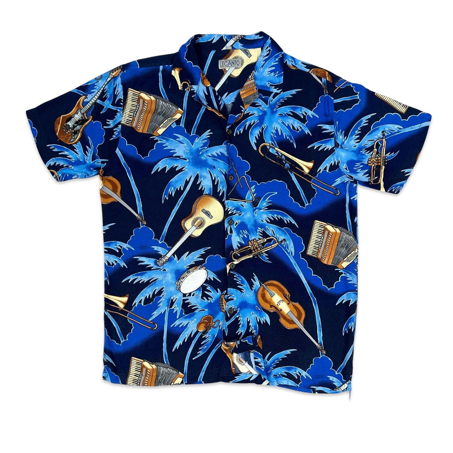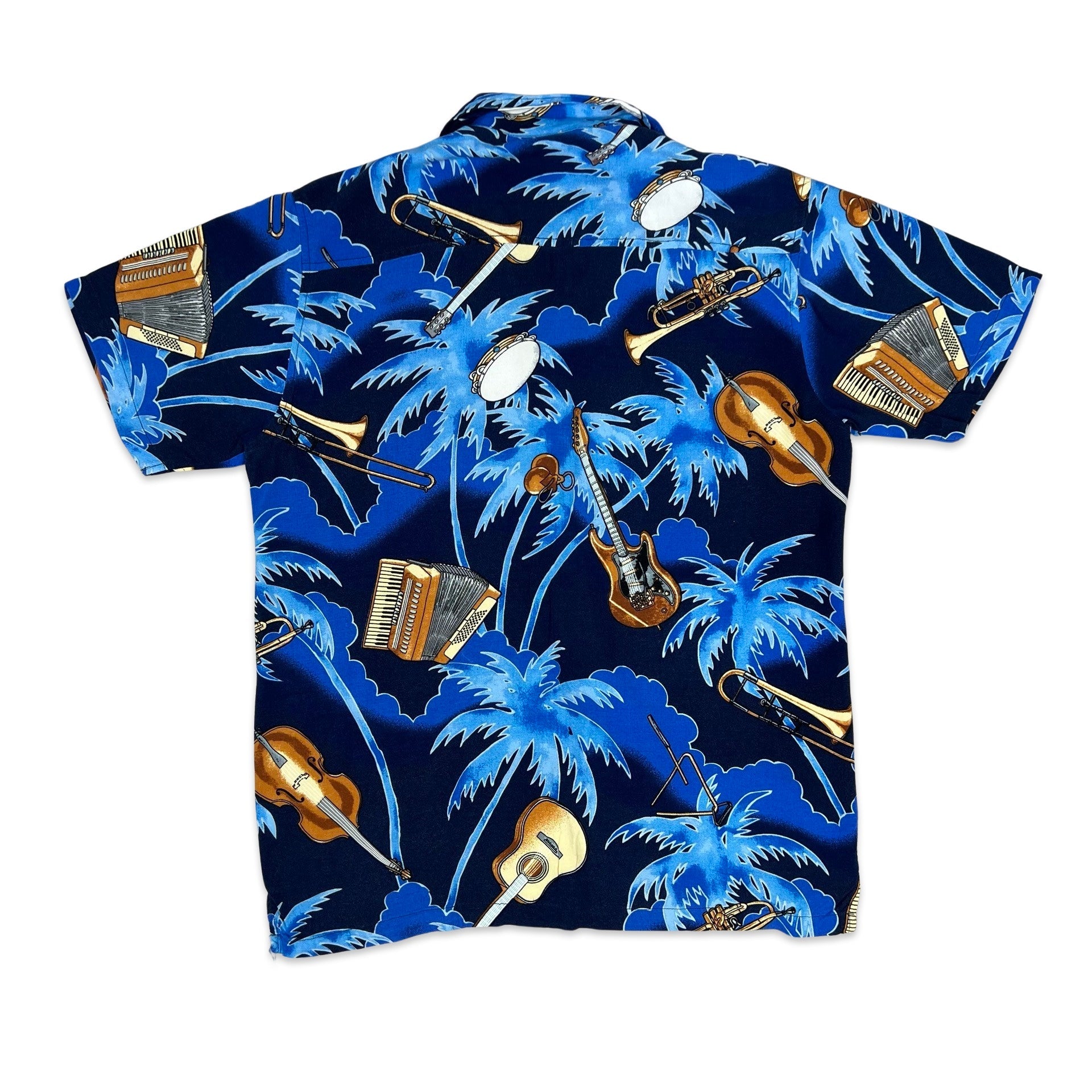 Vintage Blue Musical Instrument Print Hawaiian Shirt M L