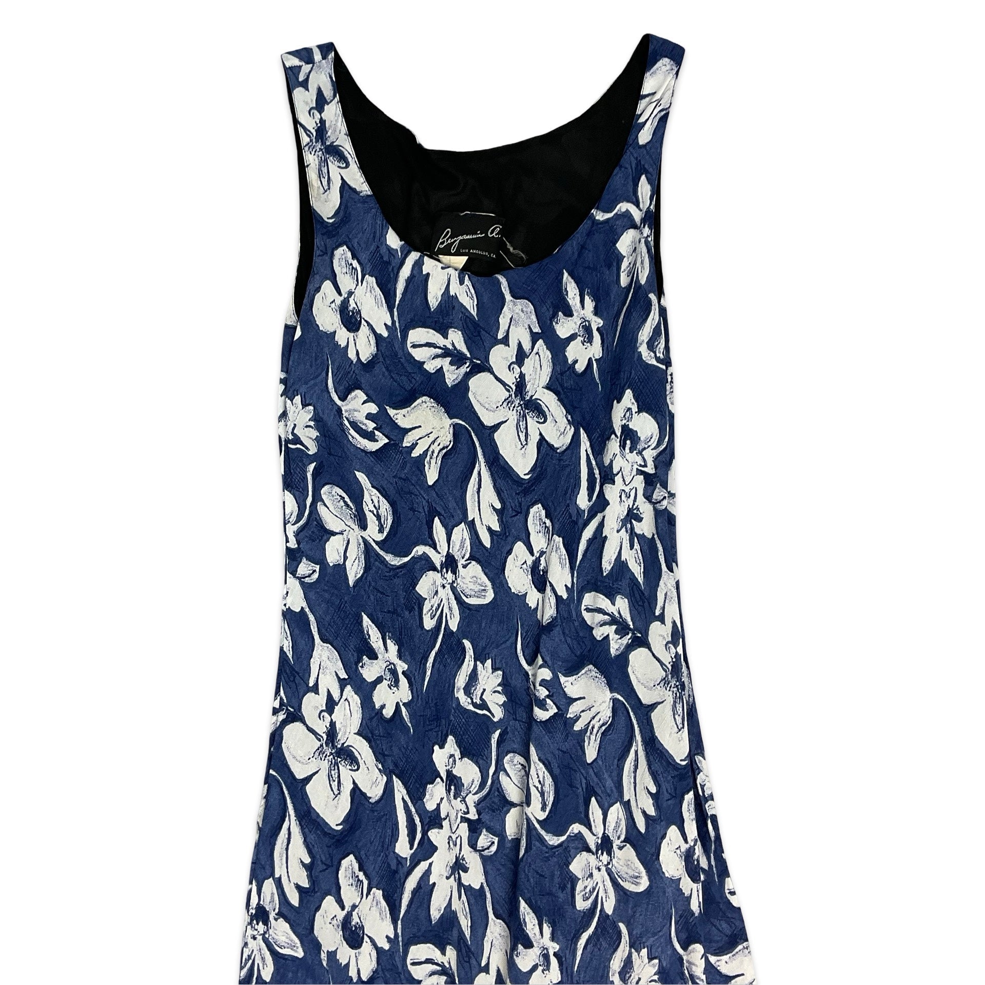 Women’s vintage maxi dress. Blue & white floral fabric. 100% Viscose. Slip on style.