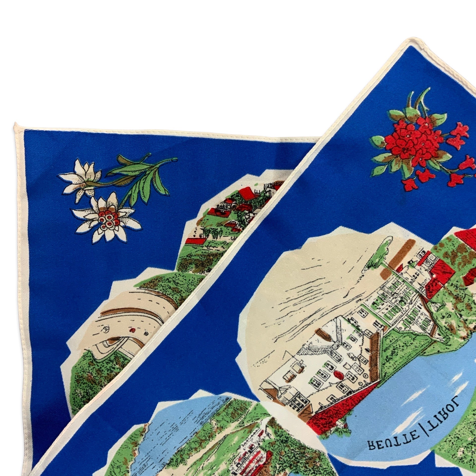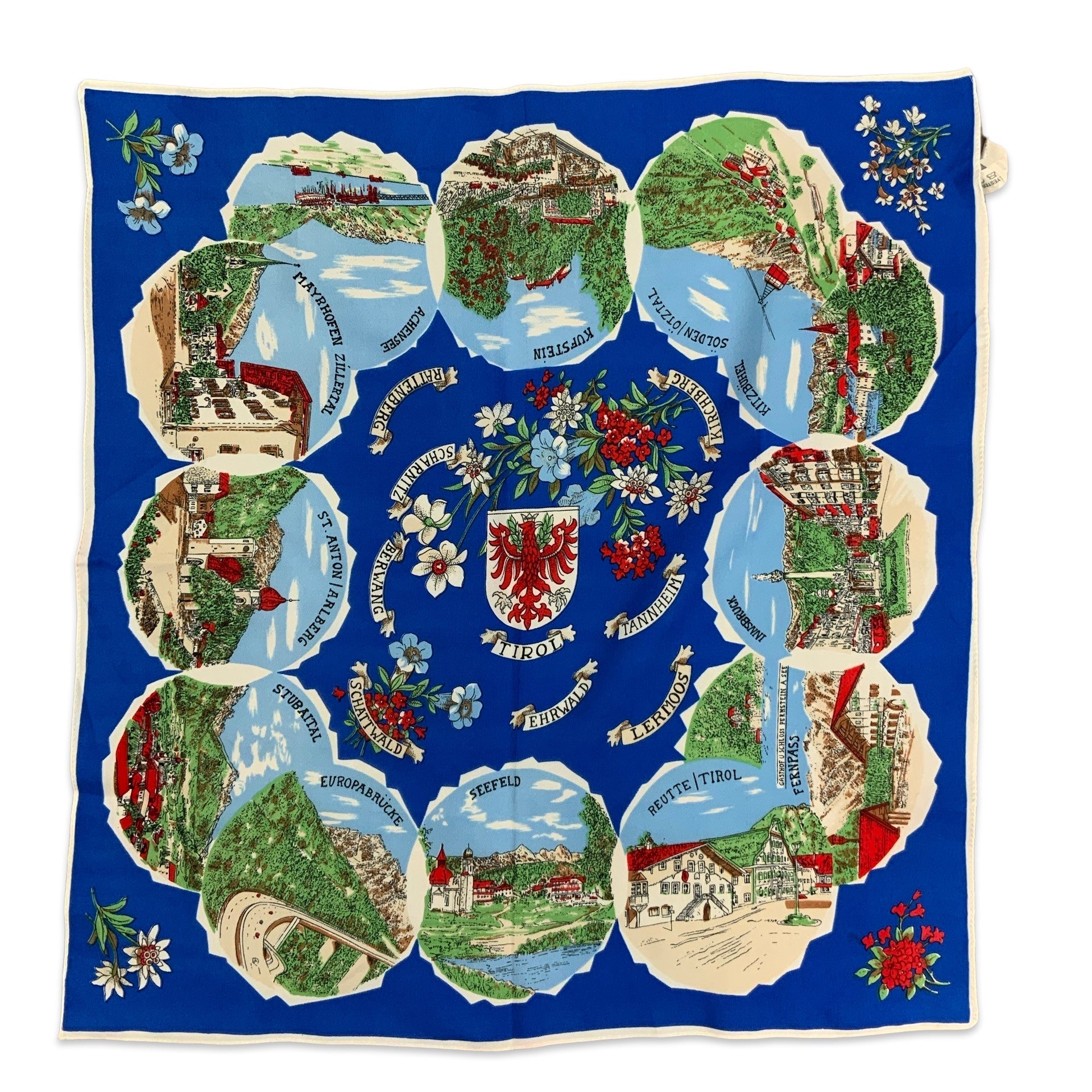 Vintage Austrian souvenir scarf with illustrated landmark and flower design. Court of arms, heraldry print. Lightweight polyester. In blue, white, red and green