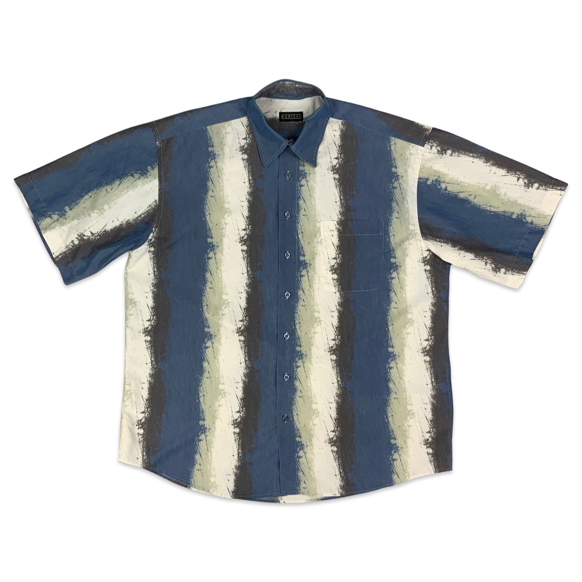 Men’s vintage short sleeve shirt. Blue, white, brown painted effect stripes with blue buttons. Soft fabric.