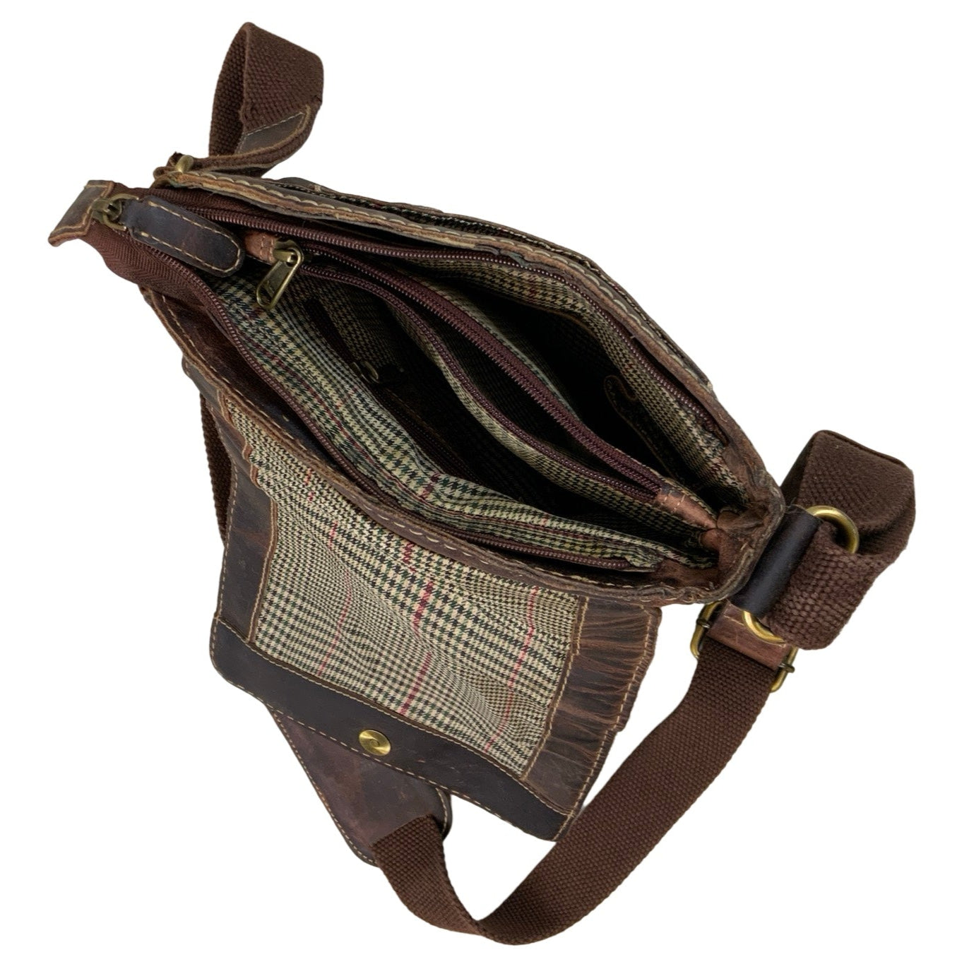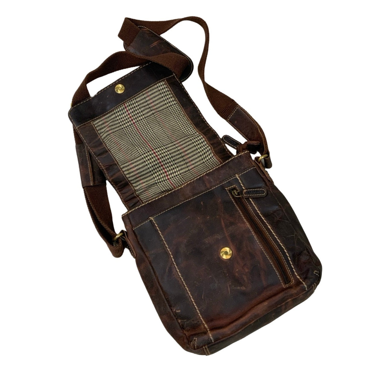 Vintage 1990s/00s Brasil's Quality Ltd leather sling messenger crossbody shoulder bag. It features an aesthetic vintage distressed leather look with a magnetic flap closure, long shoulder strap and multiple compartments within for phones, notebooks, wallets, etc. Within the bag we first see a vertical zipped compartment, and then the main two compartments sectioned by a smaller zipped compartment and within are smaller zipped compartments, all lined by a soft blue, red and cream houndstooth fabric lining. The outed of the bag, at the back, holds an additional zipped compartment.