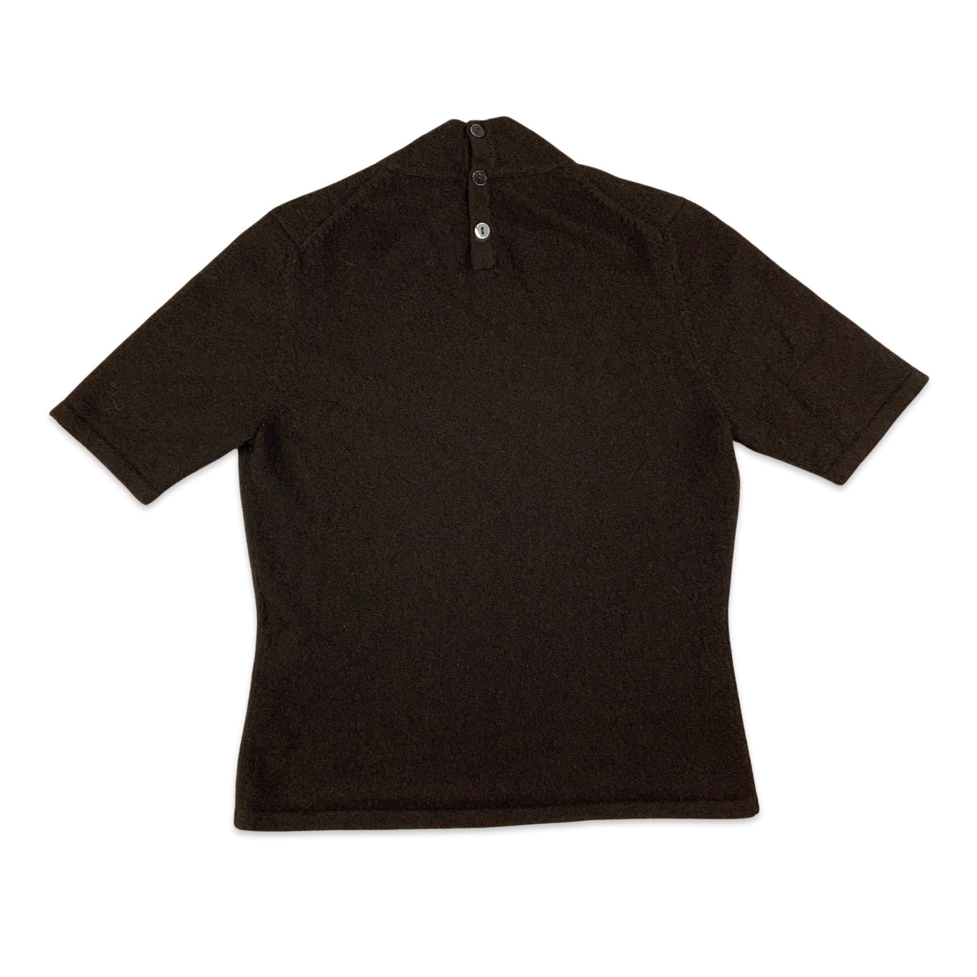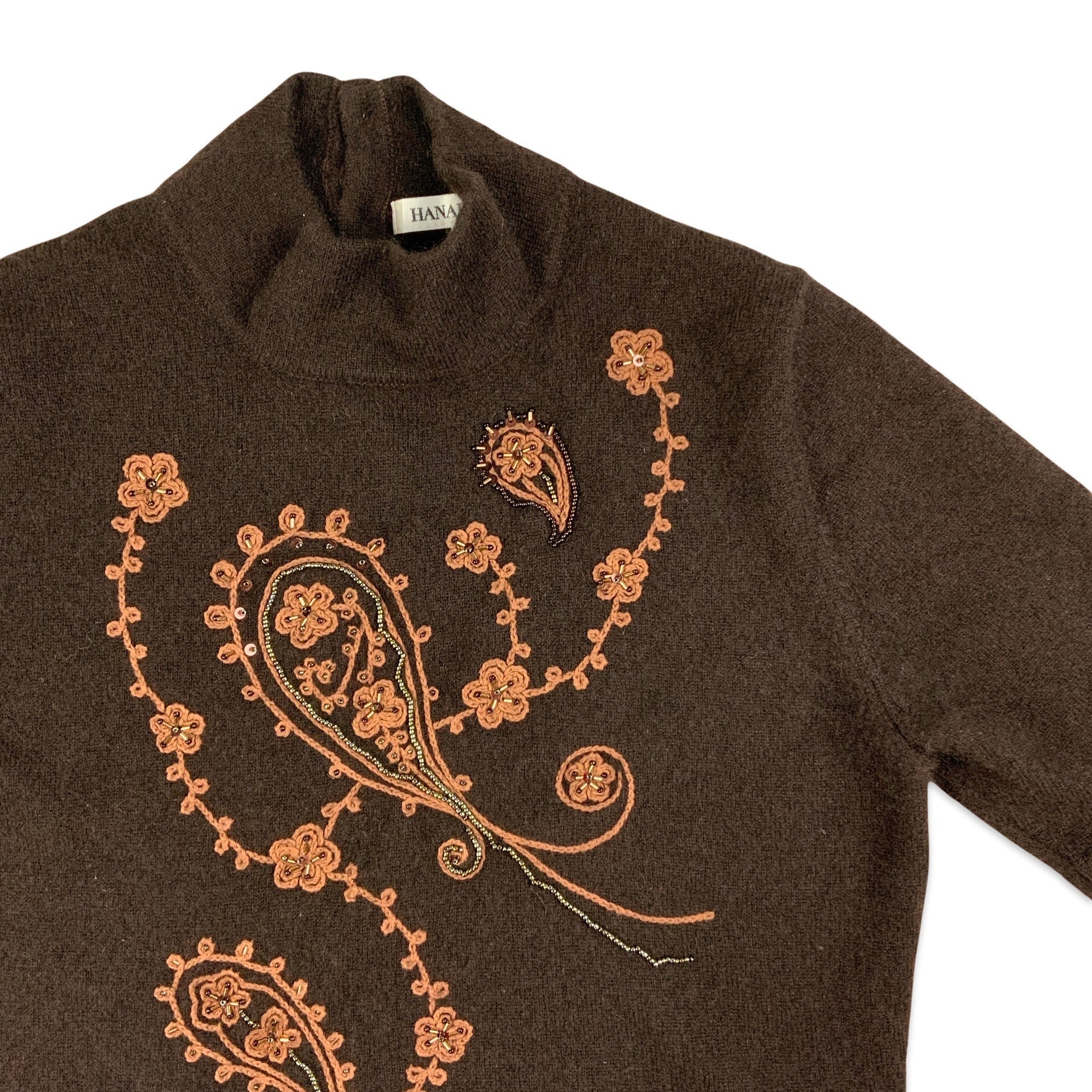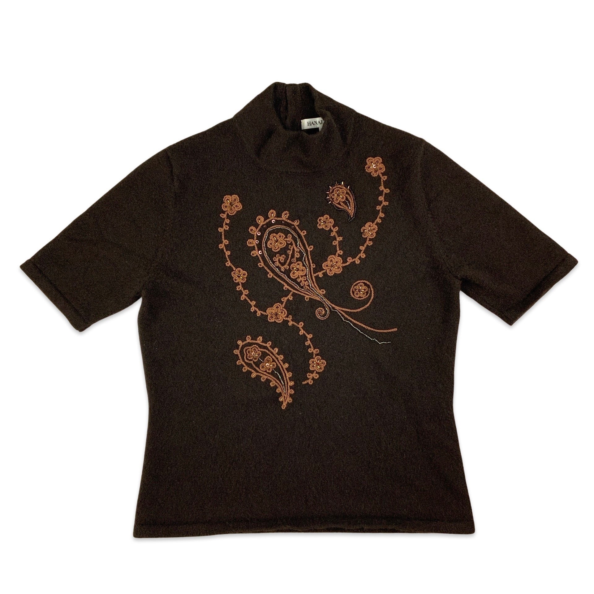 Preloved brown short sleeve jumper in brown with mock neck and orange paisley embroidery on front.
