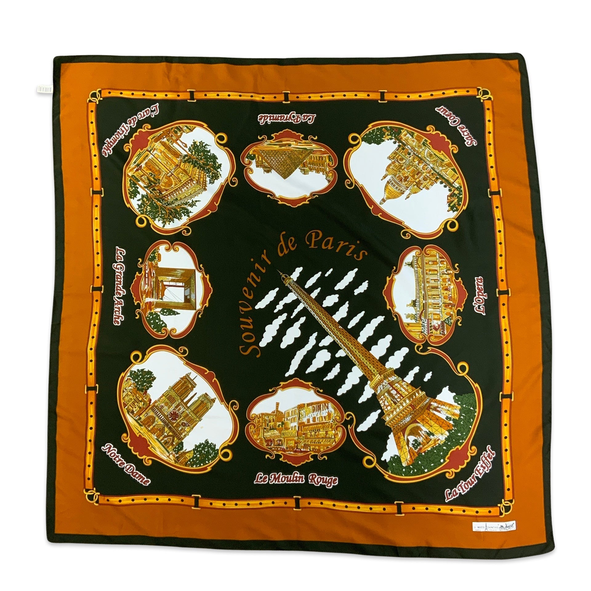 Vintage French souvenir scarf, Paris landmarks. Lightweight, polyester. Brown, gold, green, white and black.