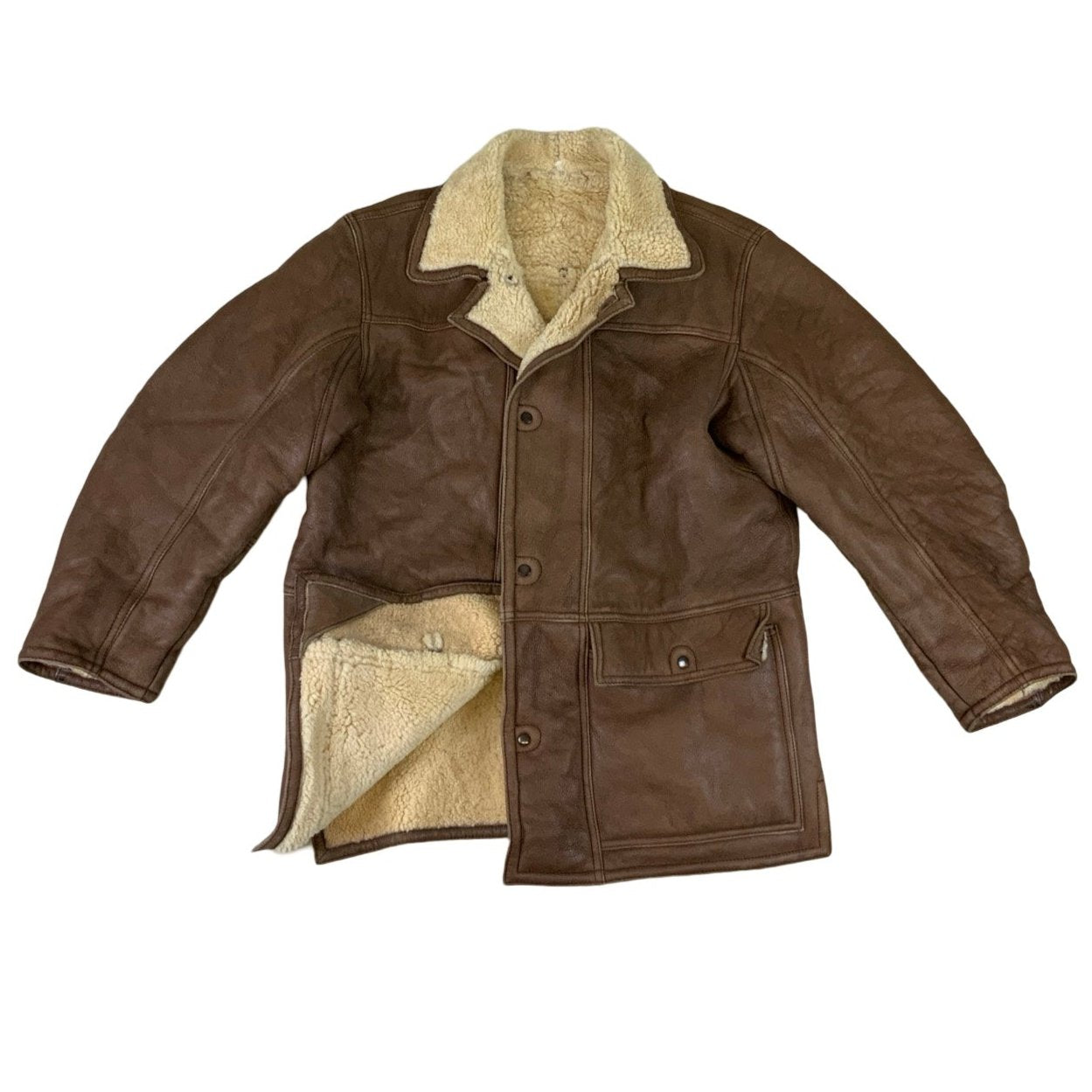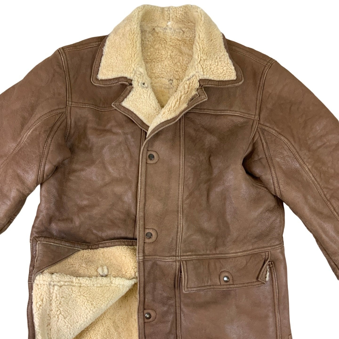 Vintage 70s sheepskin/ faux suede shearling coat with faux fur and collar. Brown with coloured. front pockets. Buttoned front fastening.