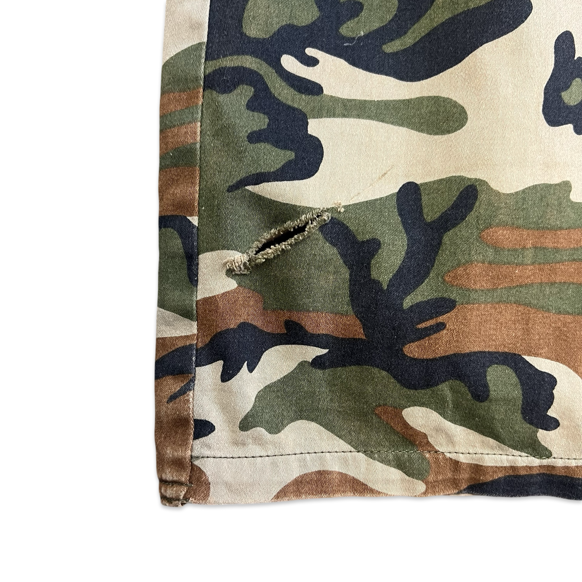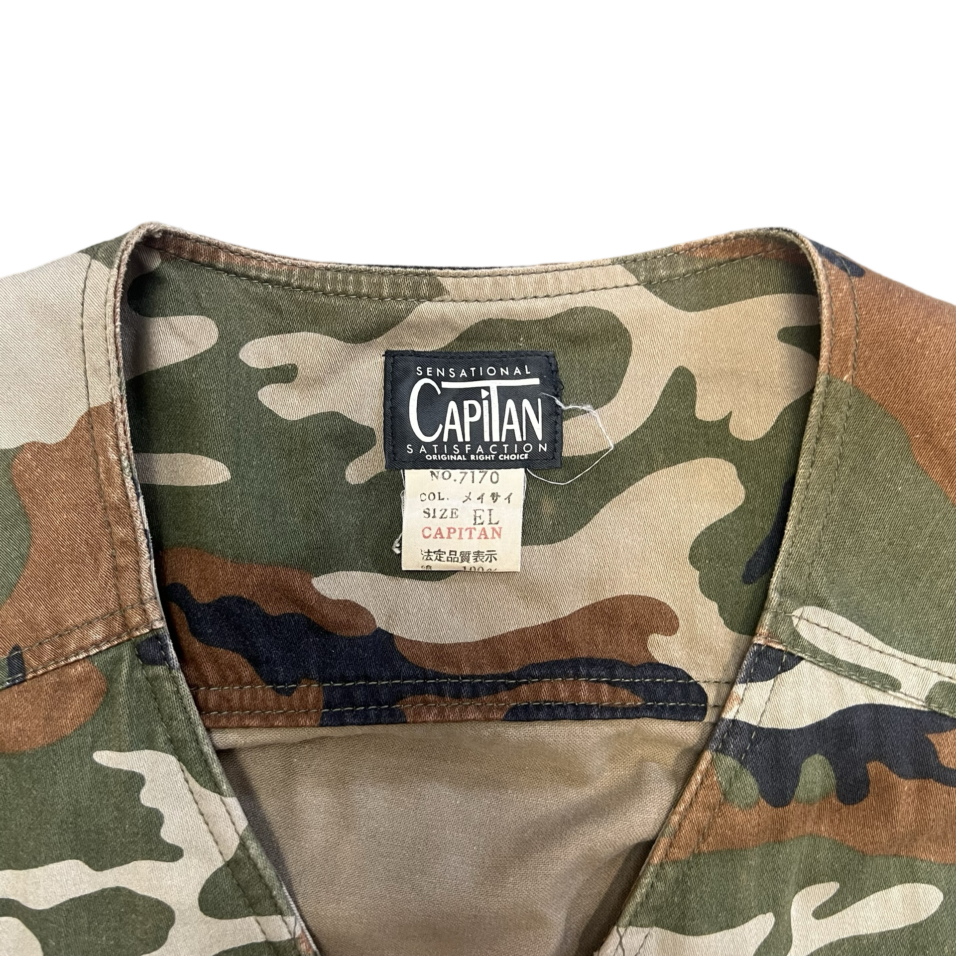 Vintage 90s utility vest in camo print canvas with multiple pockets.