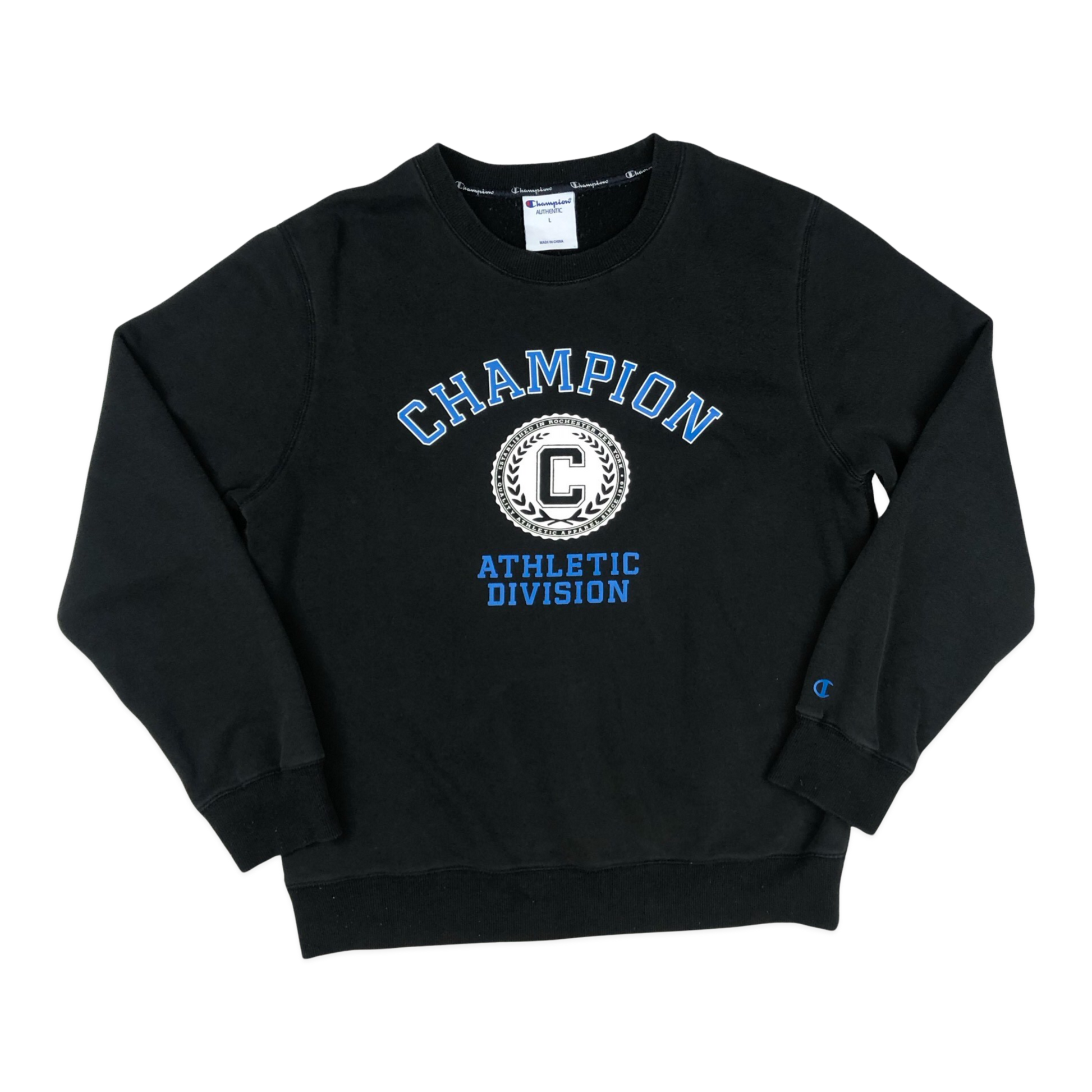 Vintage Champion black crew neck sweatshirt with large front print. Cotton polyester blend.