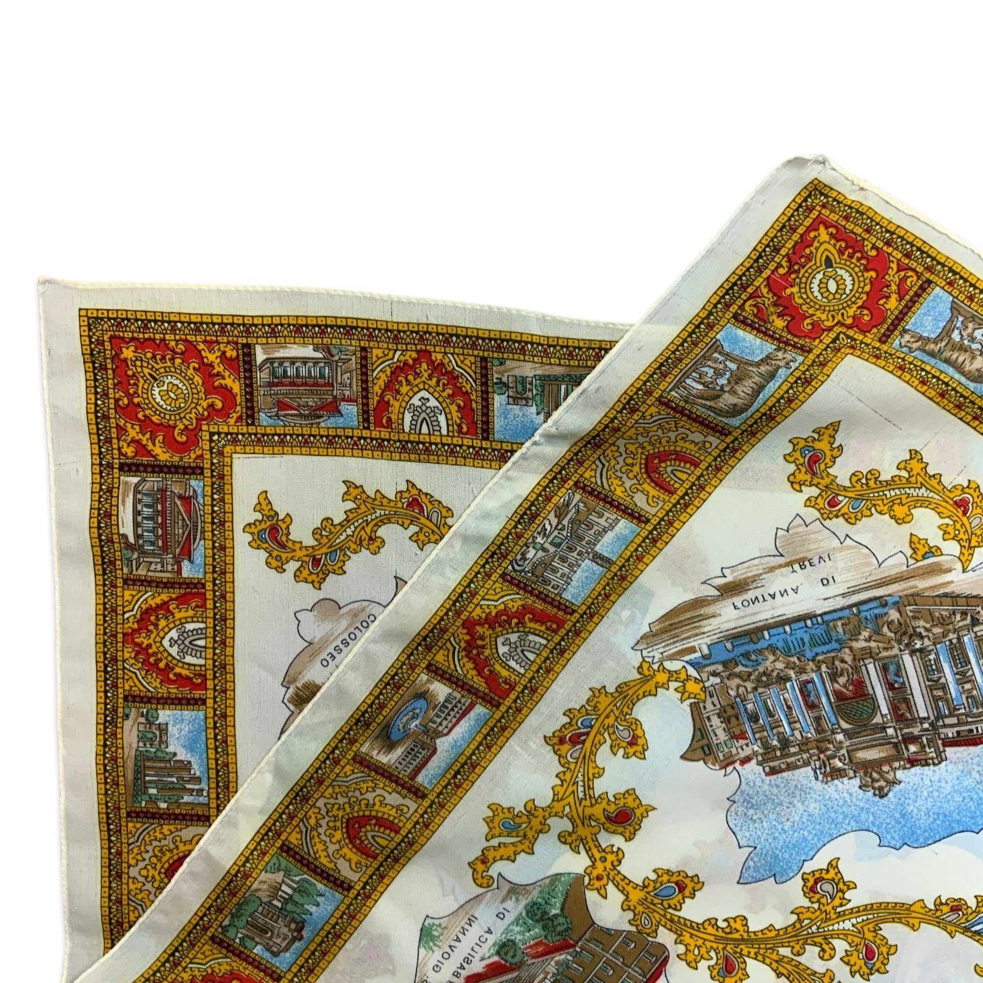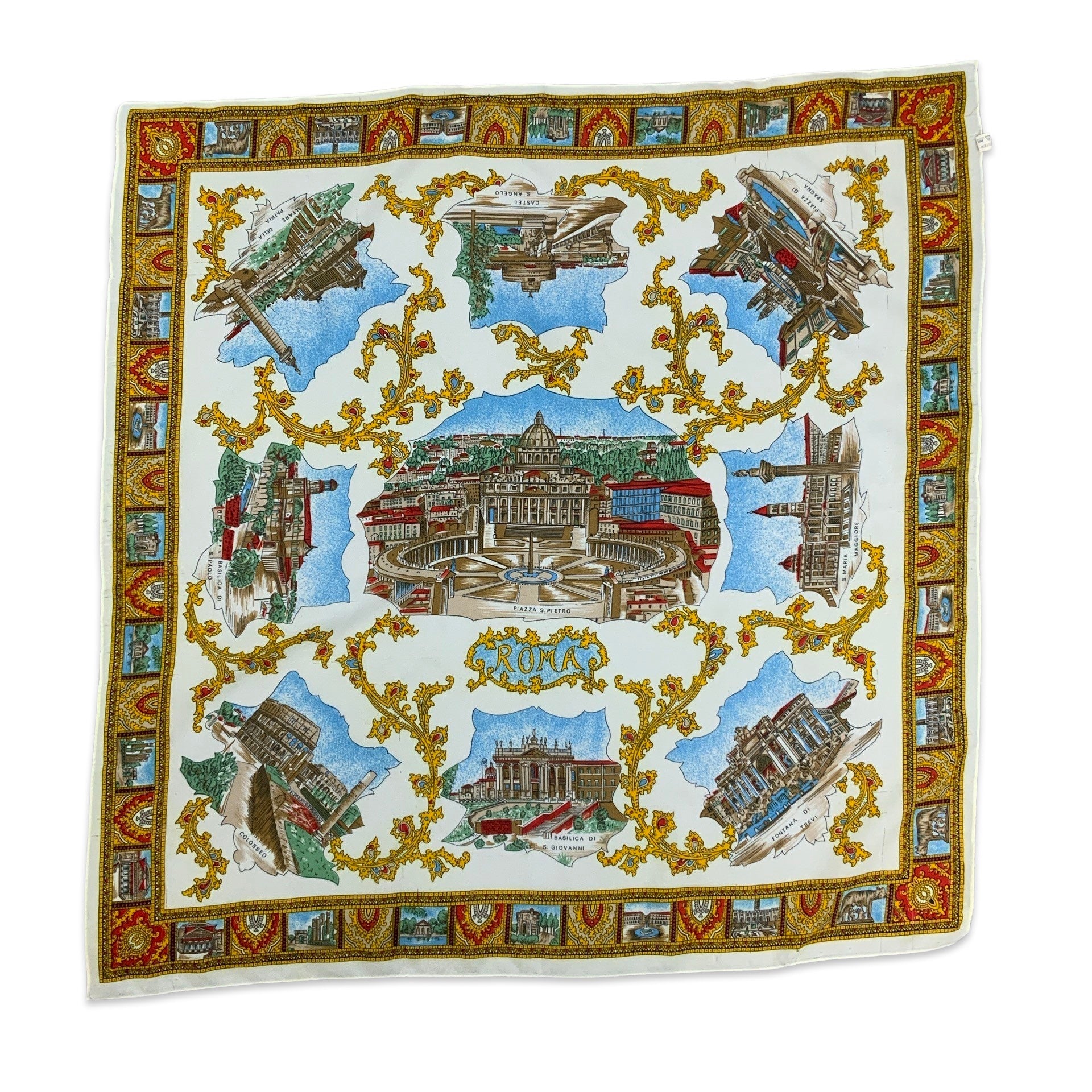 Vintage souvenir scarf from Rome, illustrated landmarks, ornate print. Lightweight, large, polyester. Multicoloured, cream, red, brown, blue and gold.