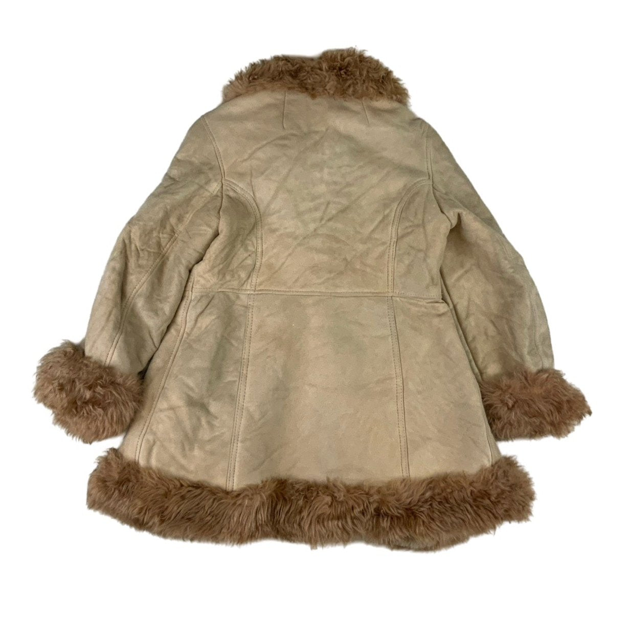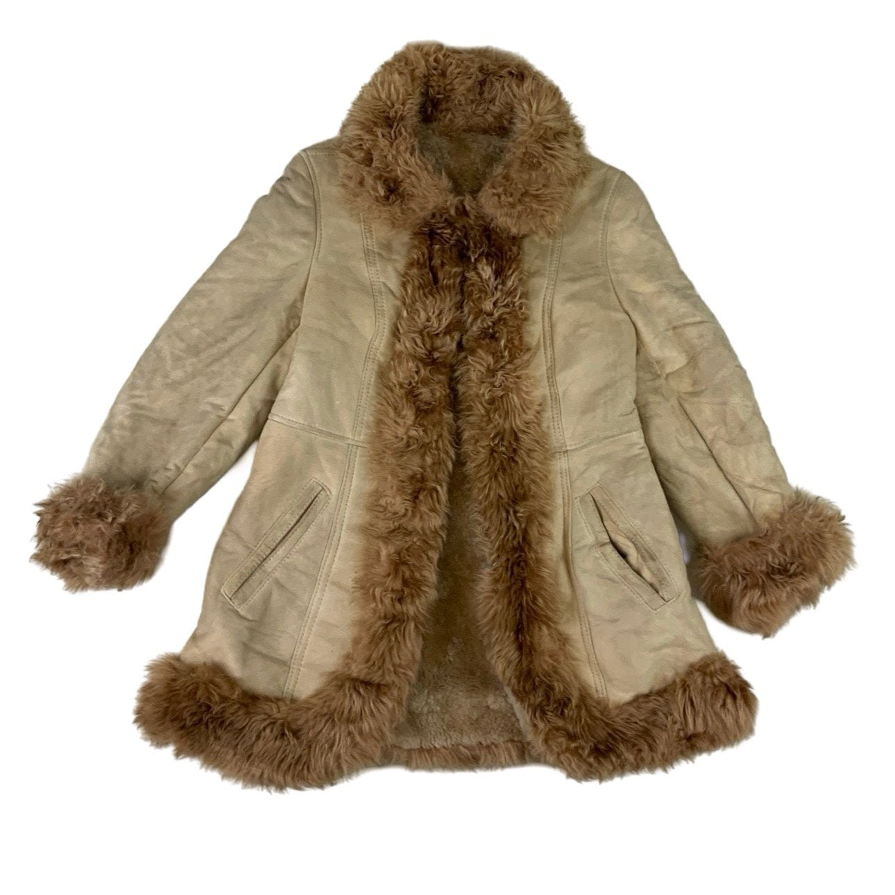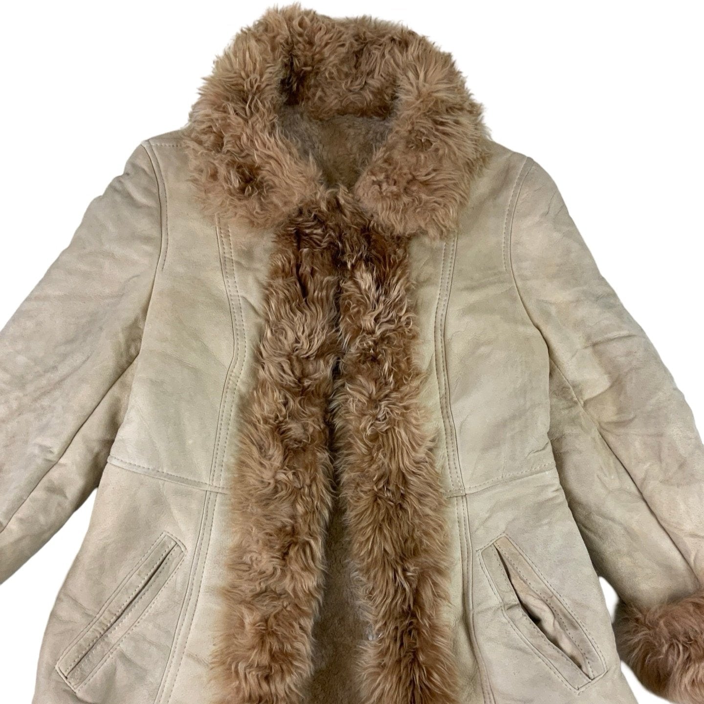 Vintage cream sheepskin/ faux suede shearling coat with faux fur/ piled fleece trim and collar. front pockets. Buttoned front fastening.