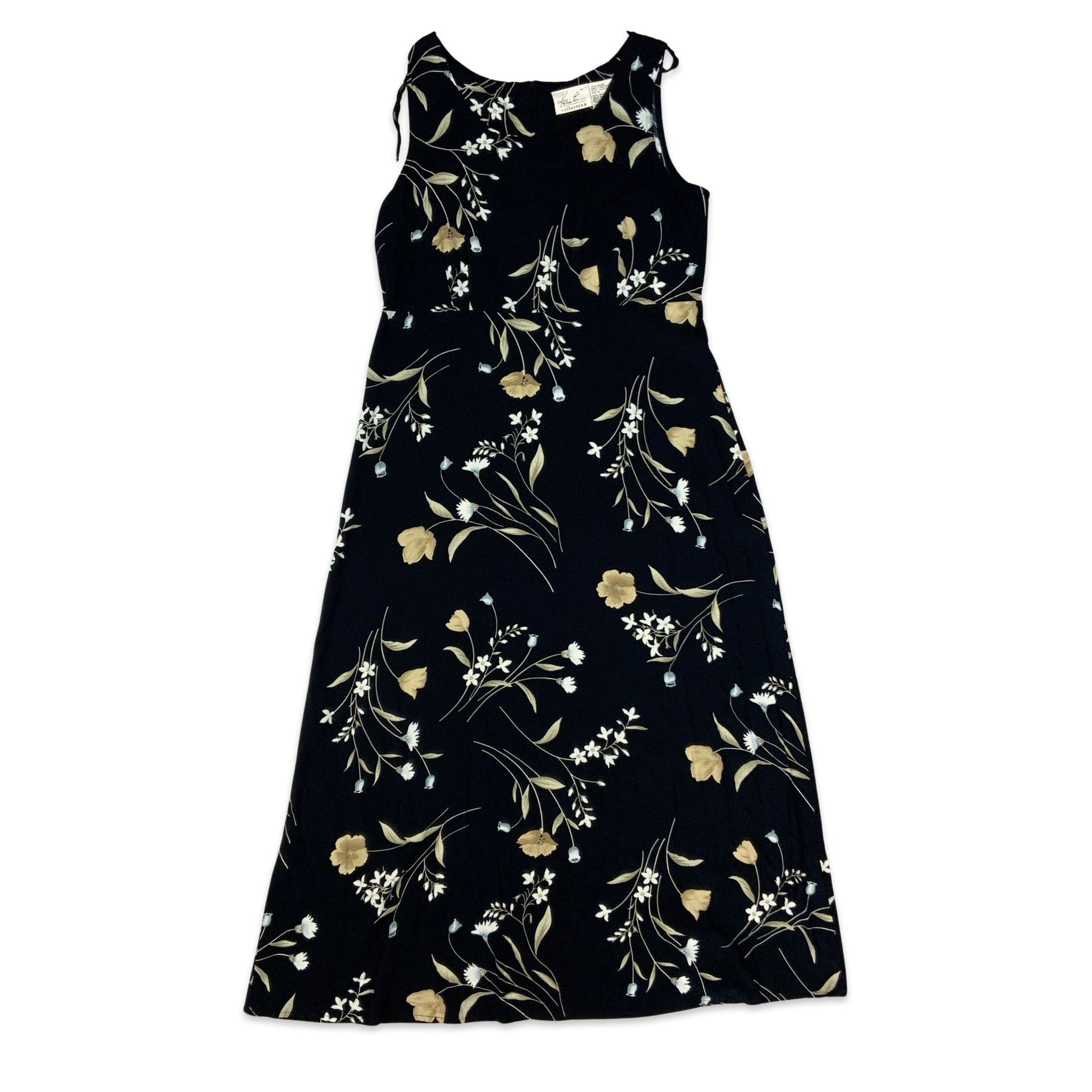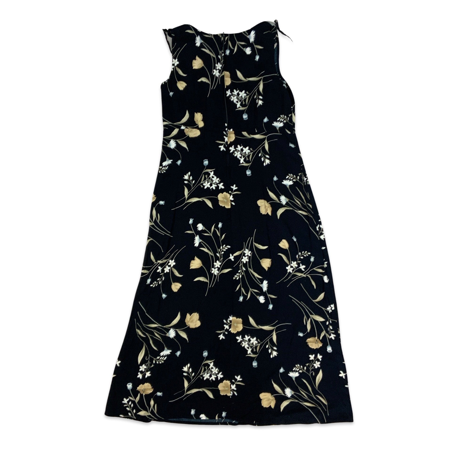 Preloved Y2K sleeveless dress in black with all-over floral / botanical print. Zip fastening at back.
