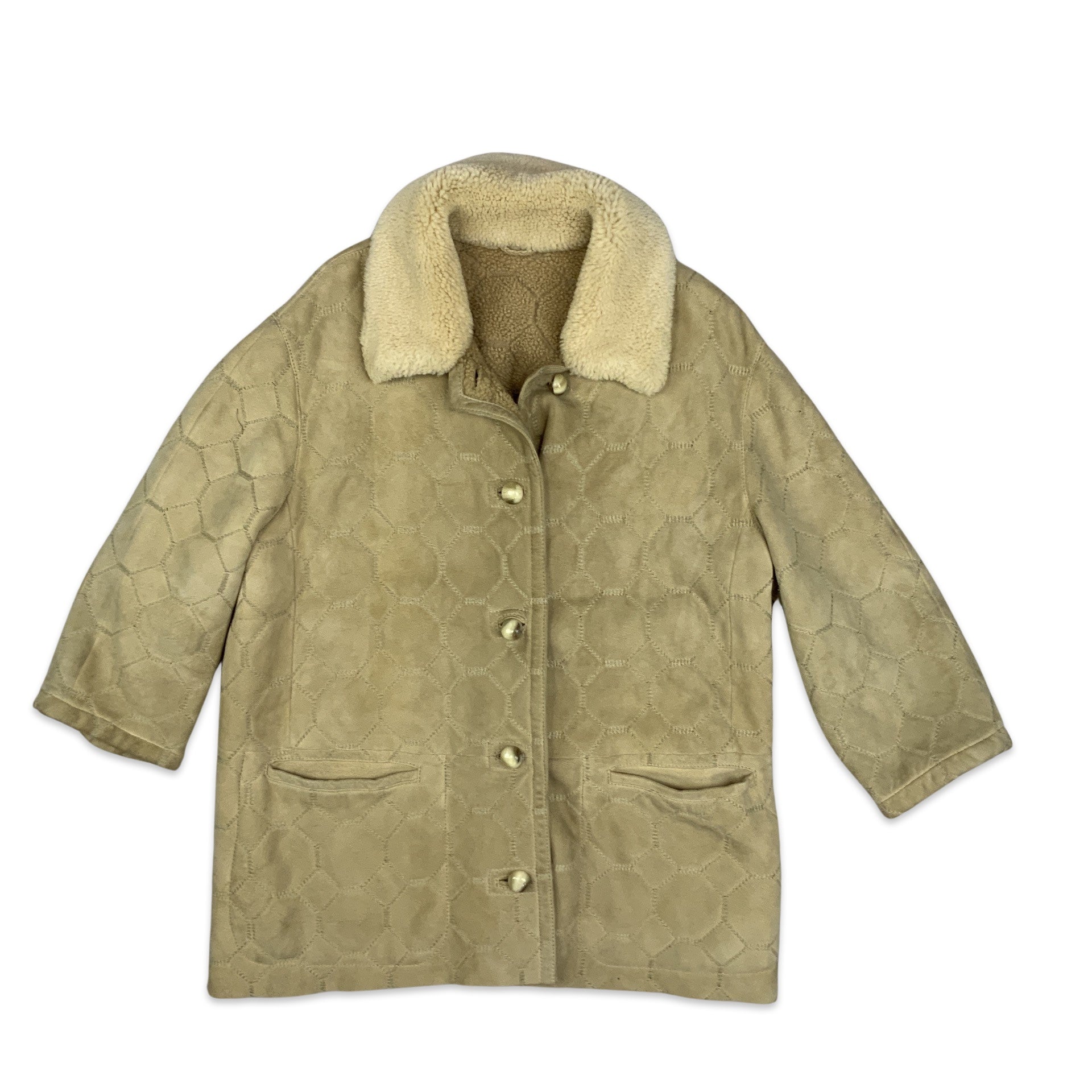 Vintage women's suede shearling coat with piled fleece lining. Geometric octagonal quilted stitch detail. Button up front fastening. Two deep front pockets.