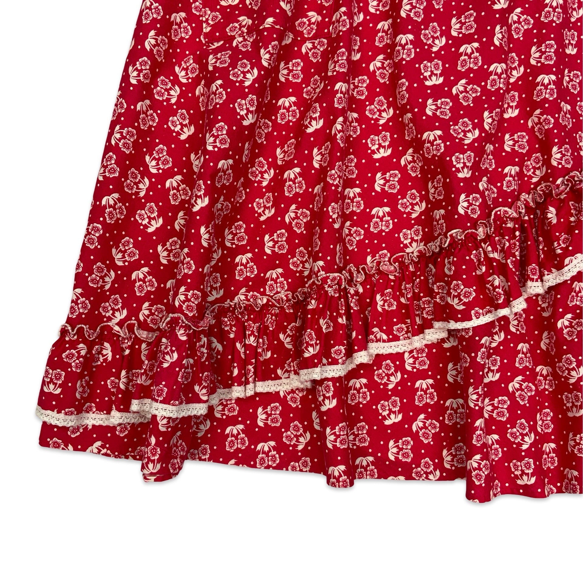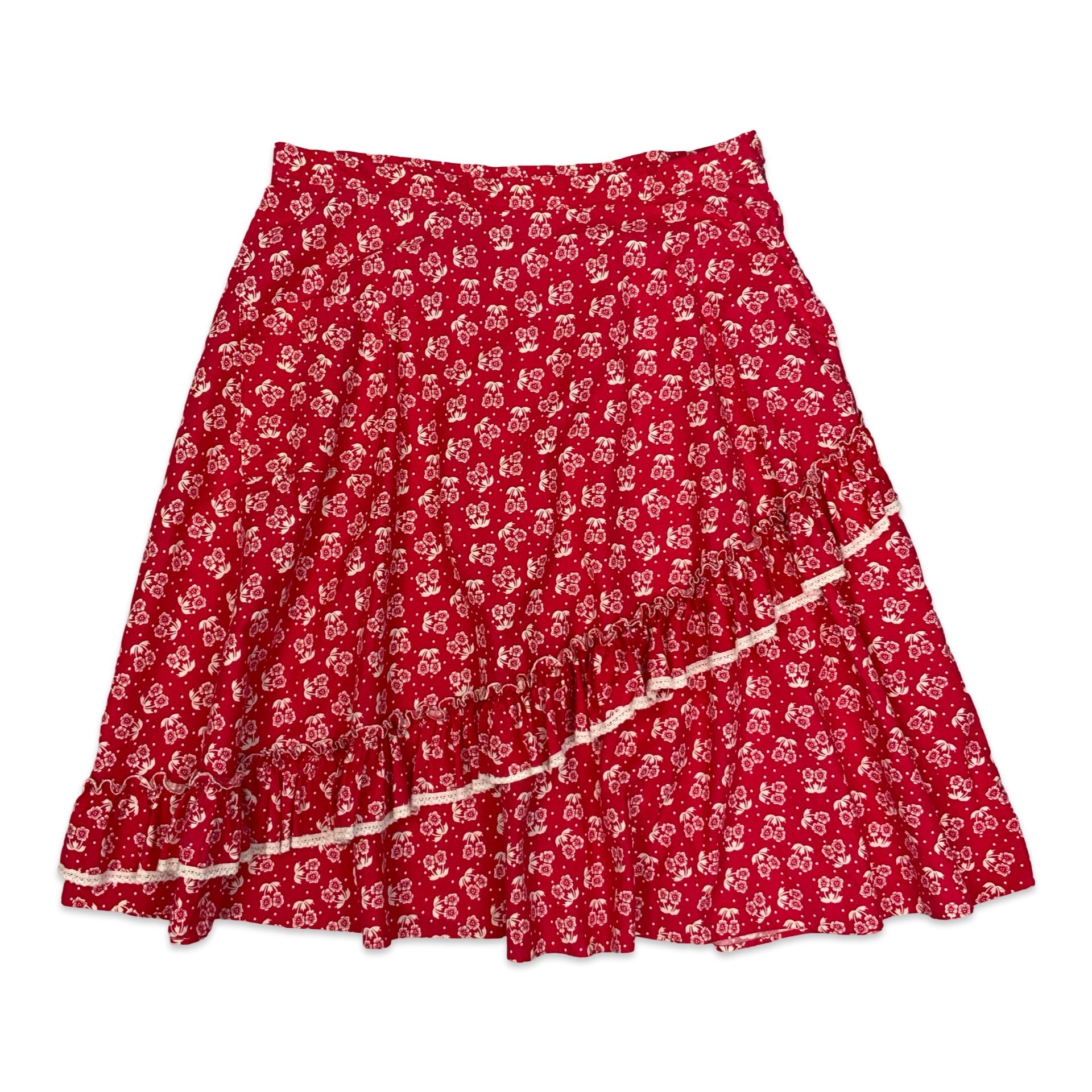 Women's vintage aline skirt. Red & white floral print with tiered pleated detail & pocket on the front. Side button & zip fastening.