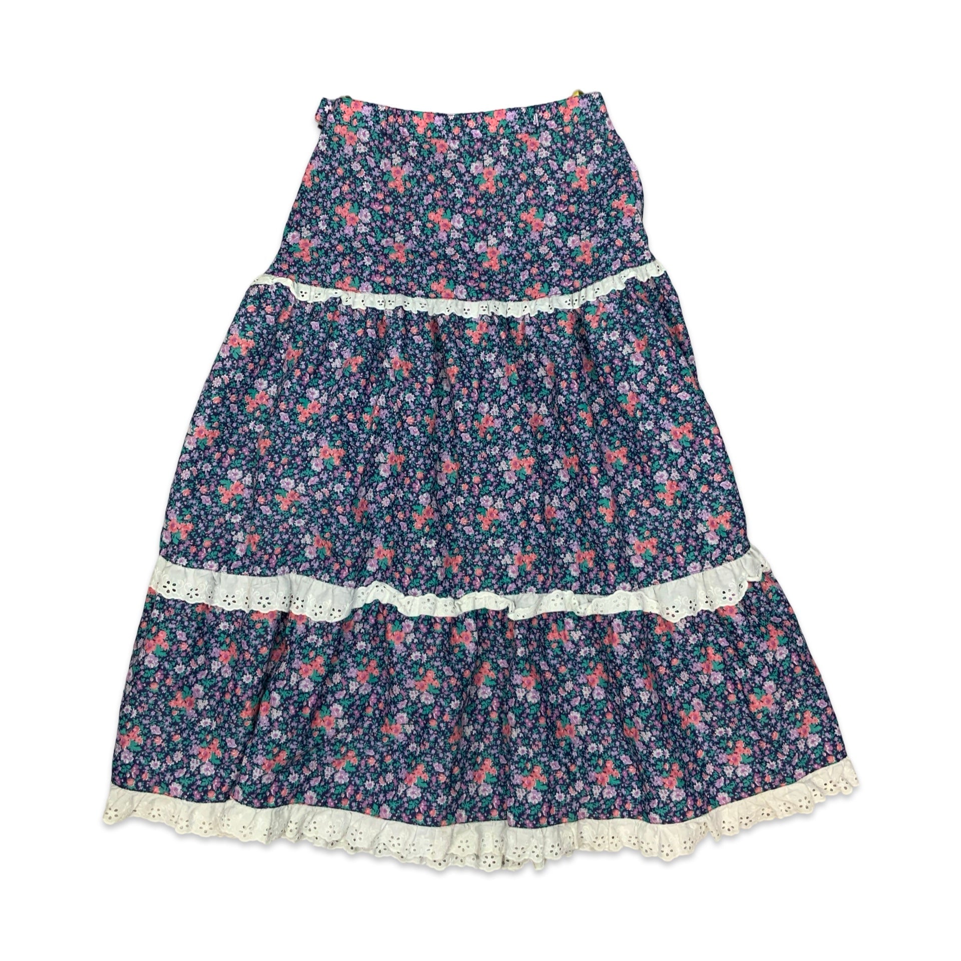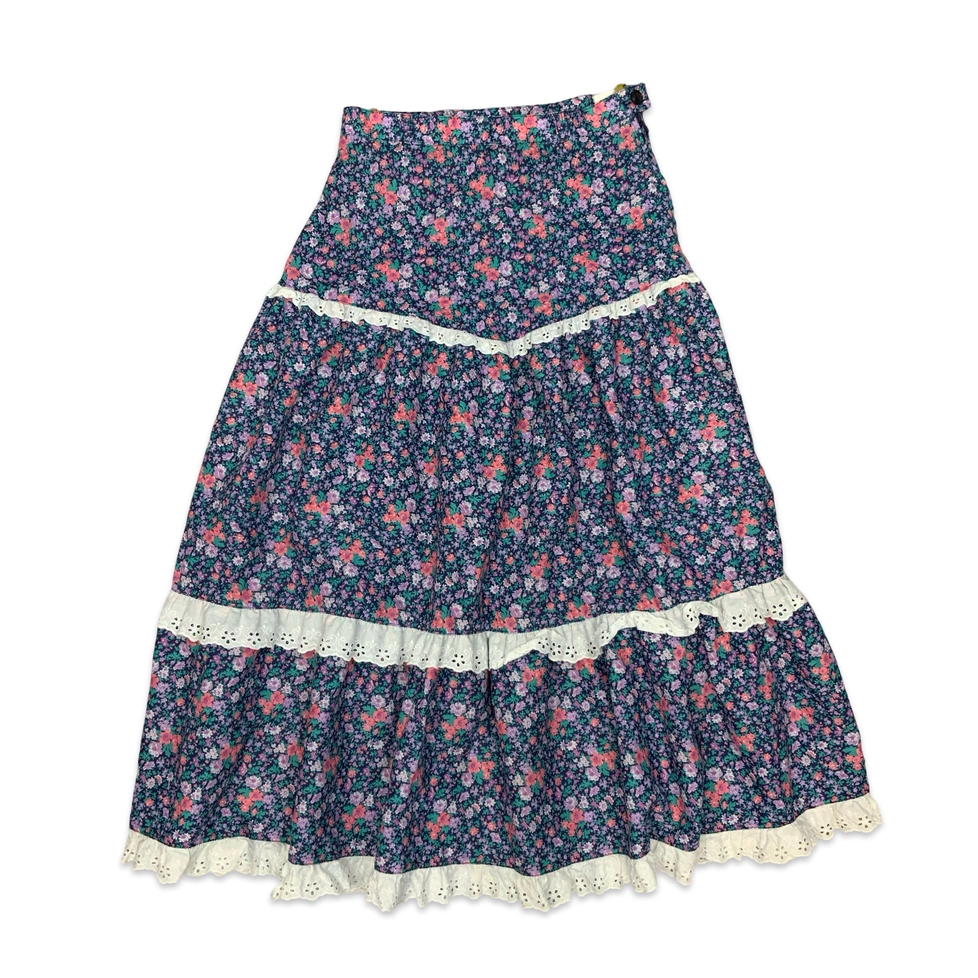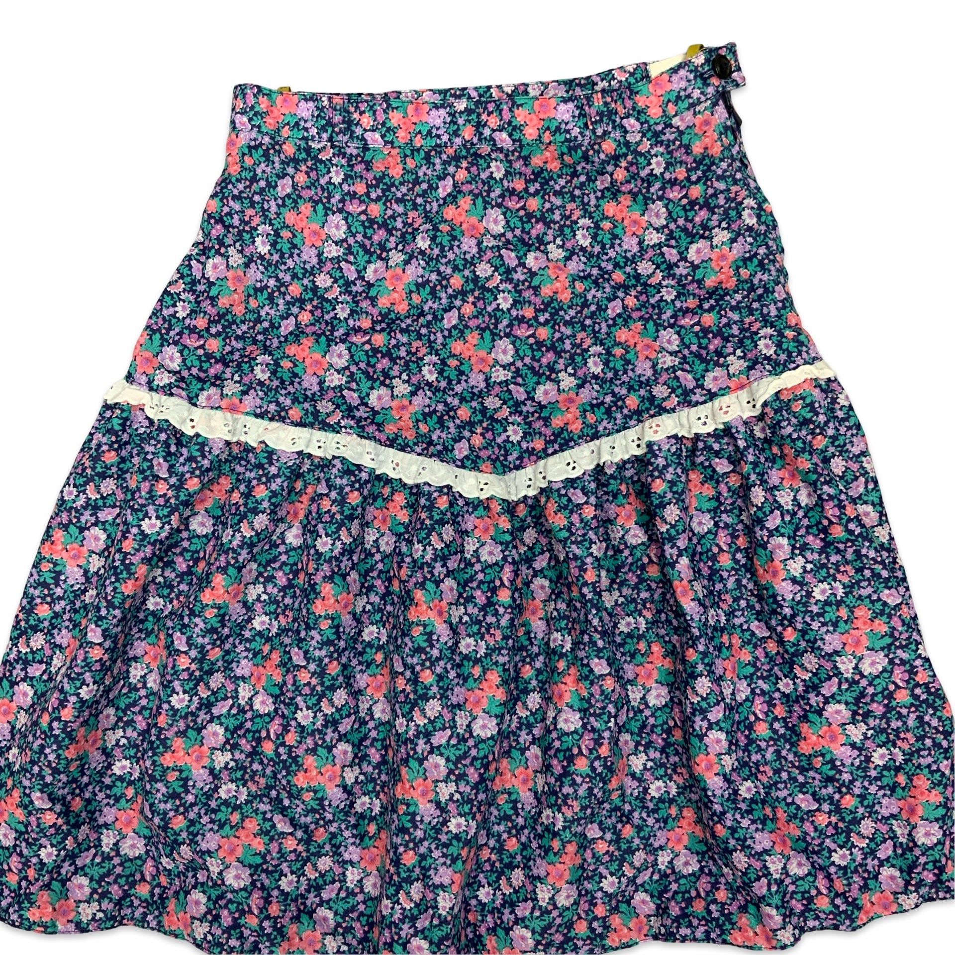 Women’s vintage prairie skirt. Purple, pink, navy & green ditsy floral print with white lace trim. Side zip and button fastening. Has belt loops.