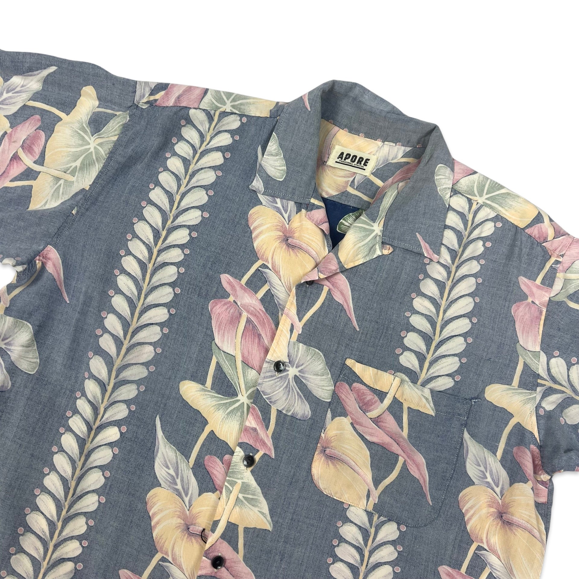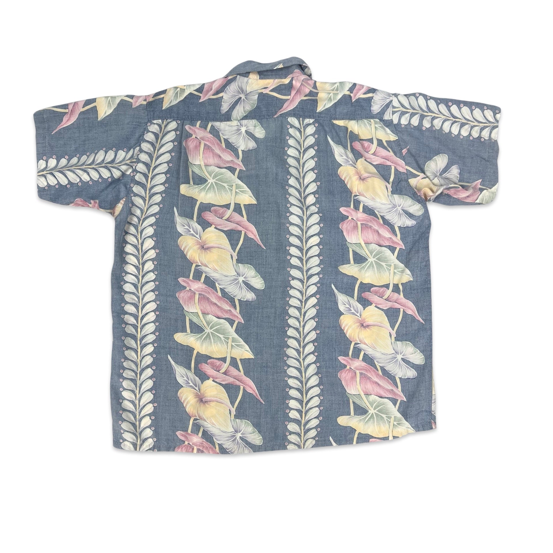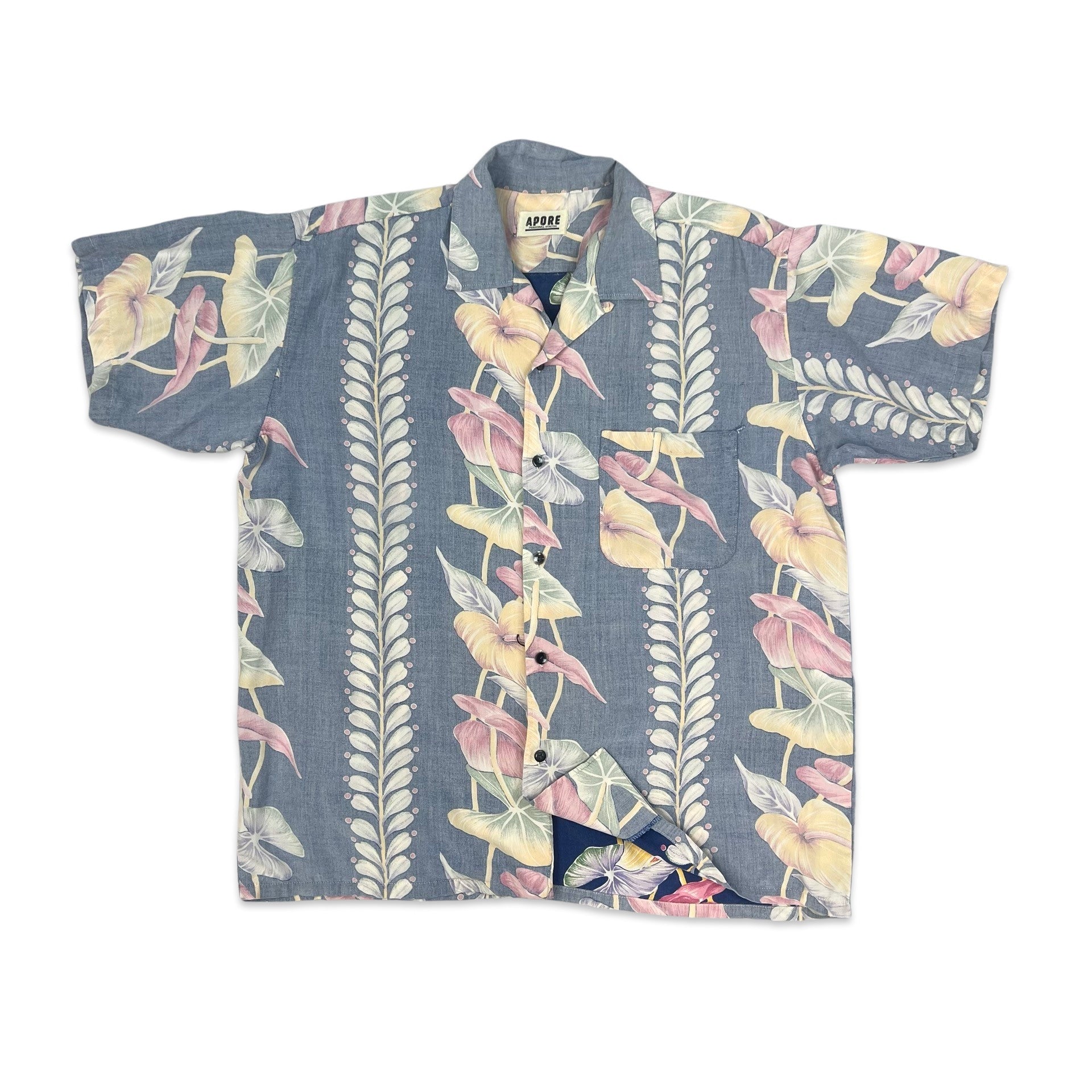Vintage Y2K inside-out print floral Hawaiian style men's shirt in blue and pink.