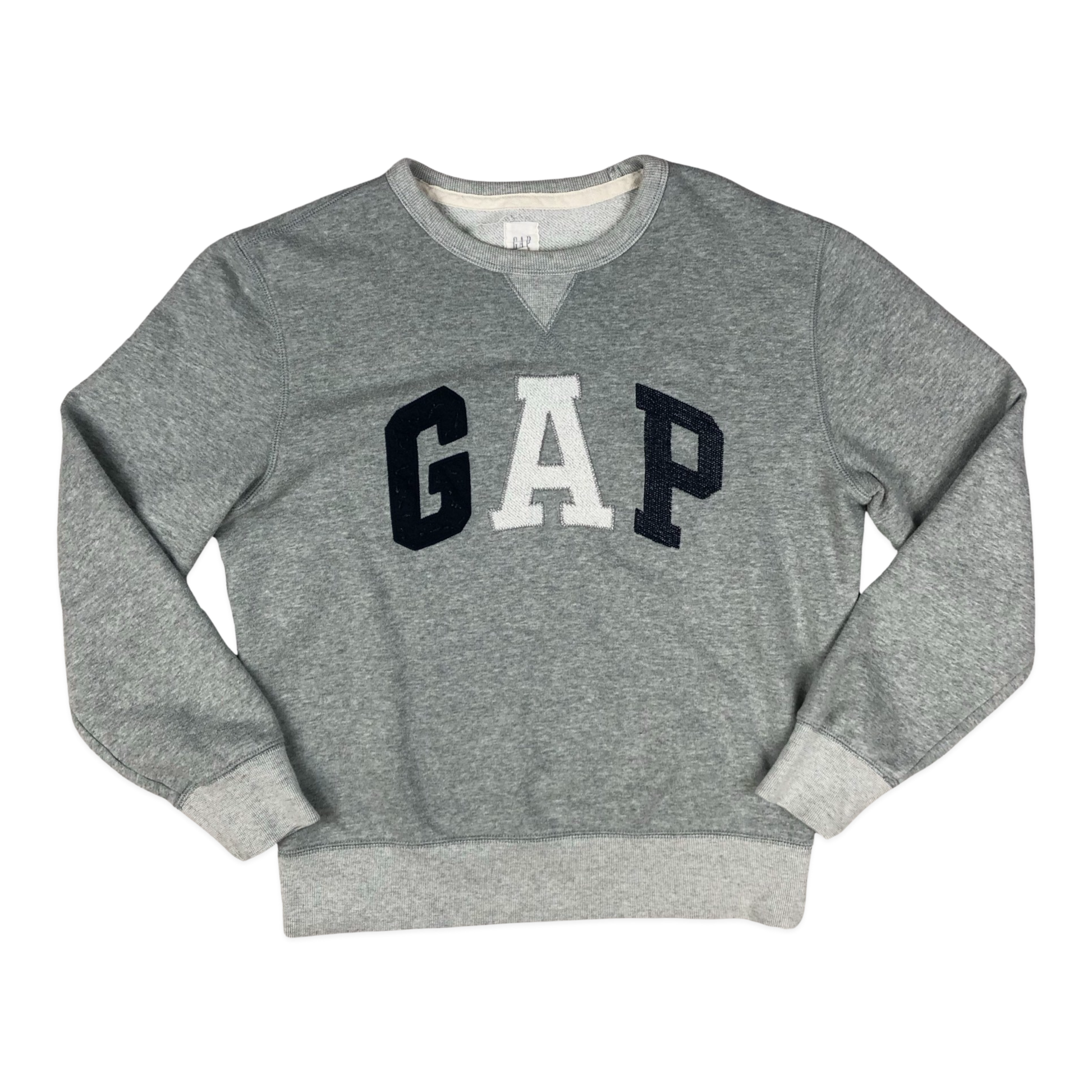 Vintage grey GAP lightweight crew neck sweatshirt with patch embroidered logo across front in white and navy.