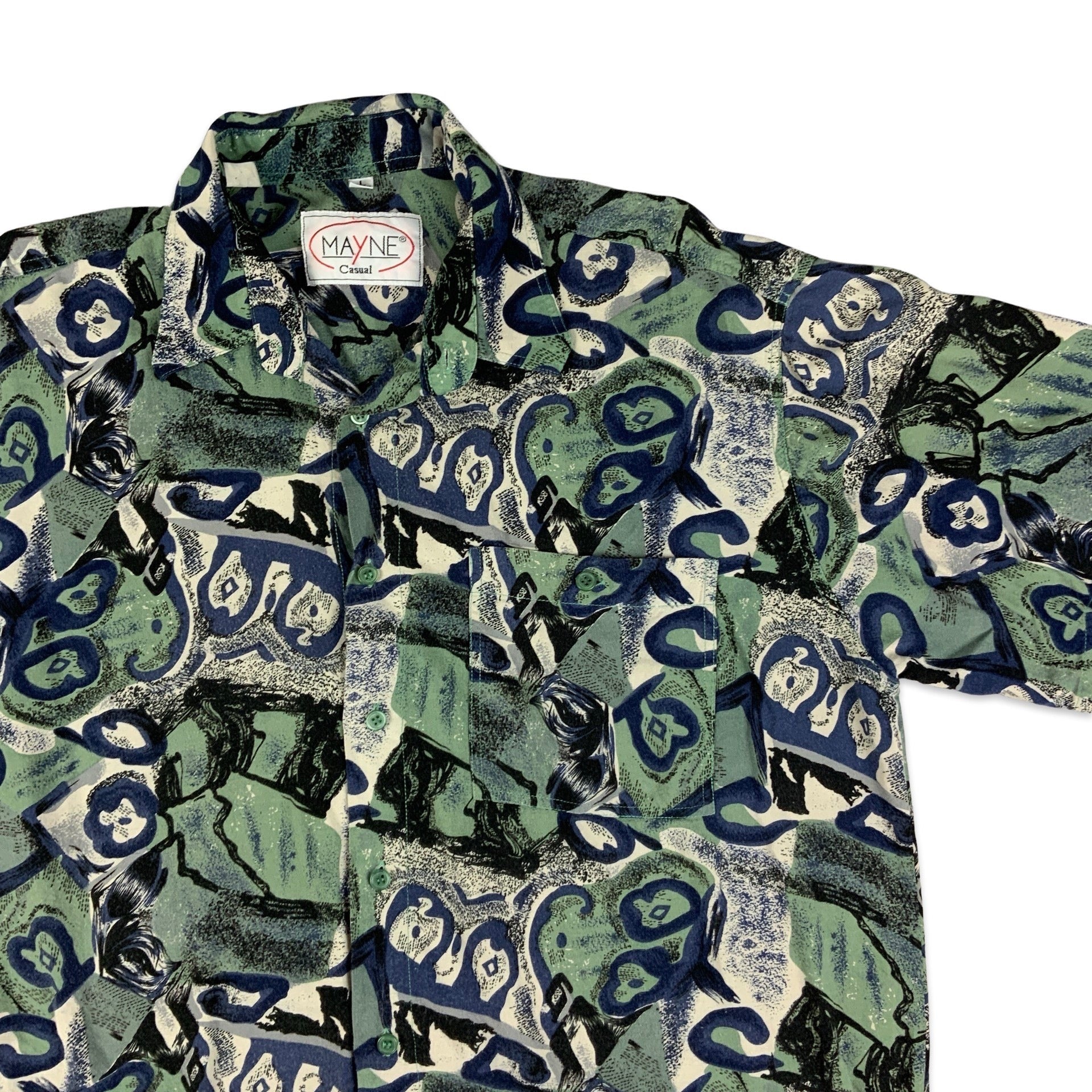 Vintage short sleeved shirt with abstract print in green, blue, and black.