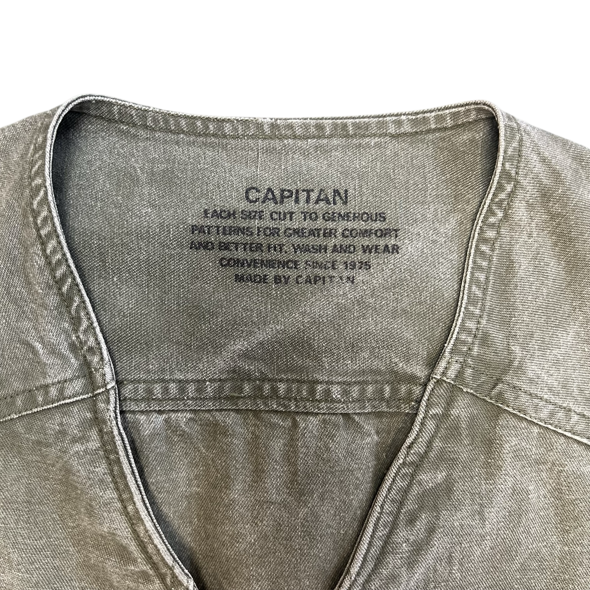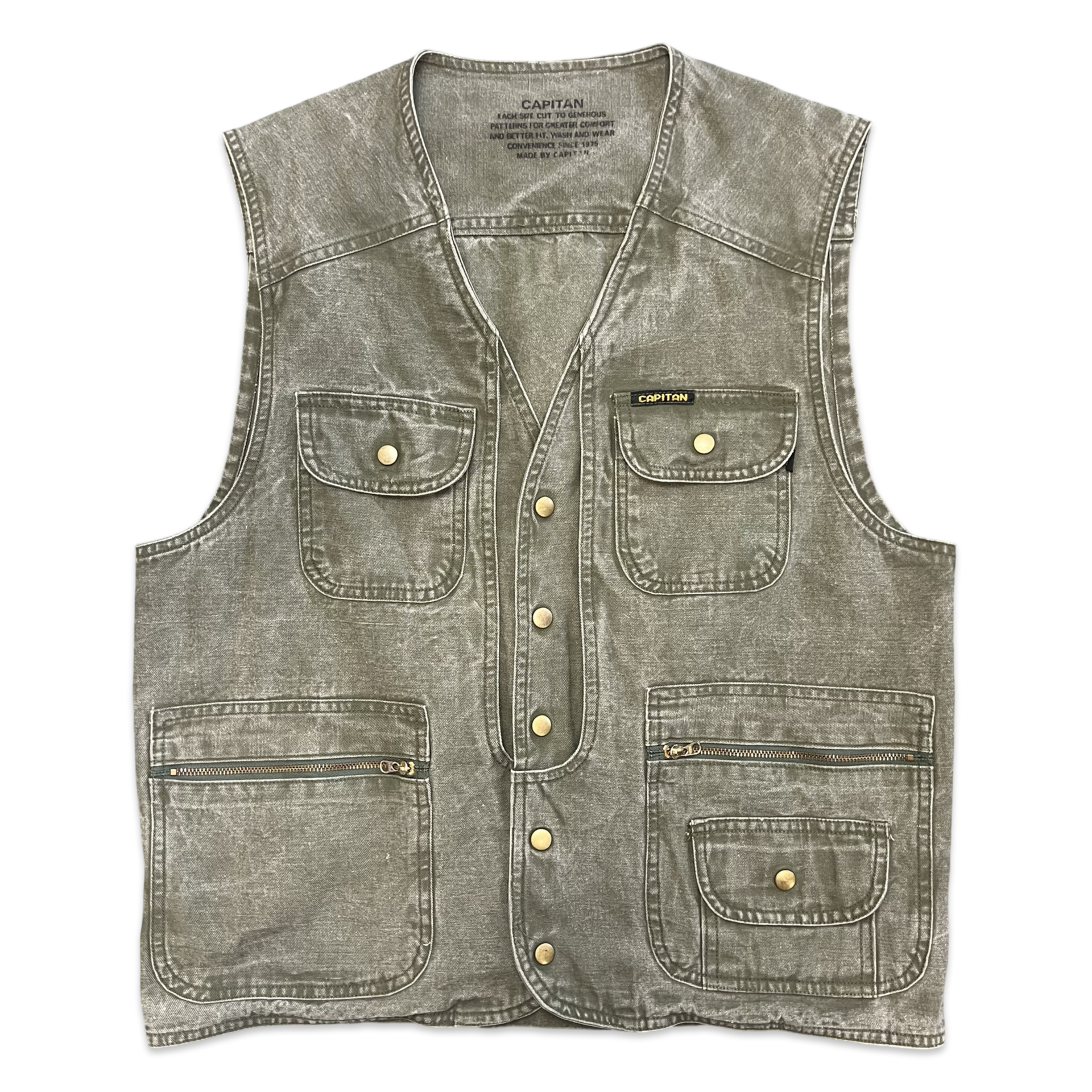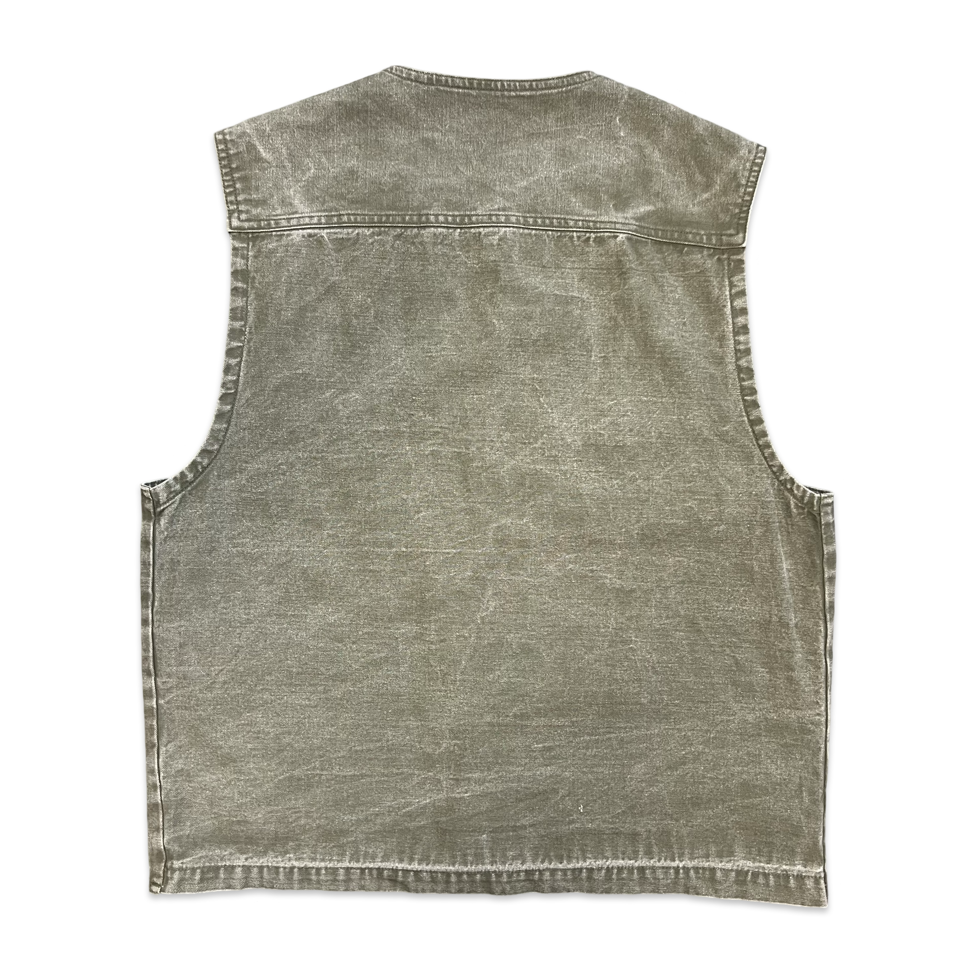 Vintage 90s utility vest in green canvas with multiple pockets.