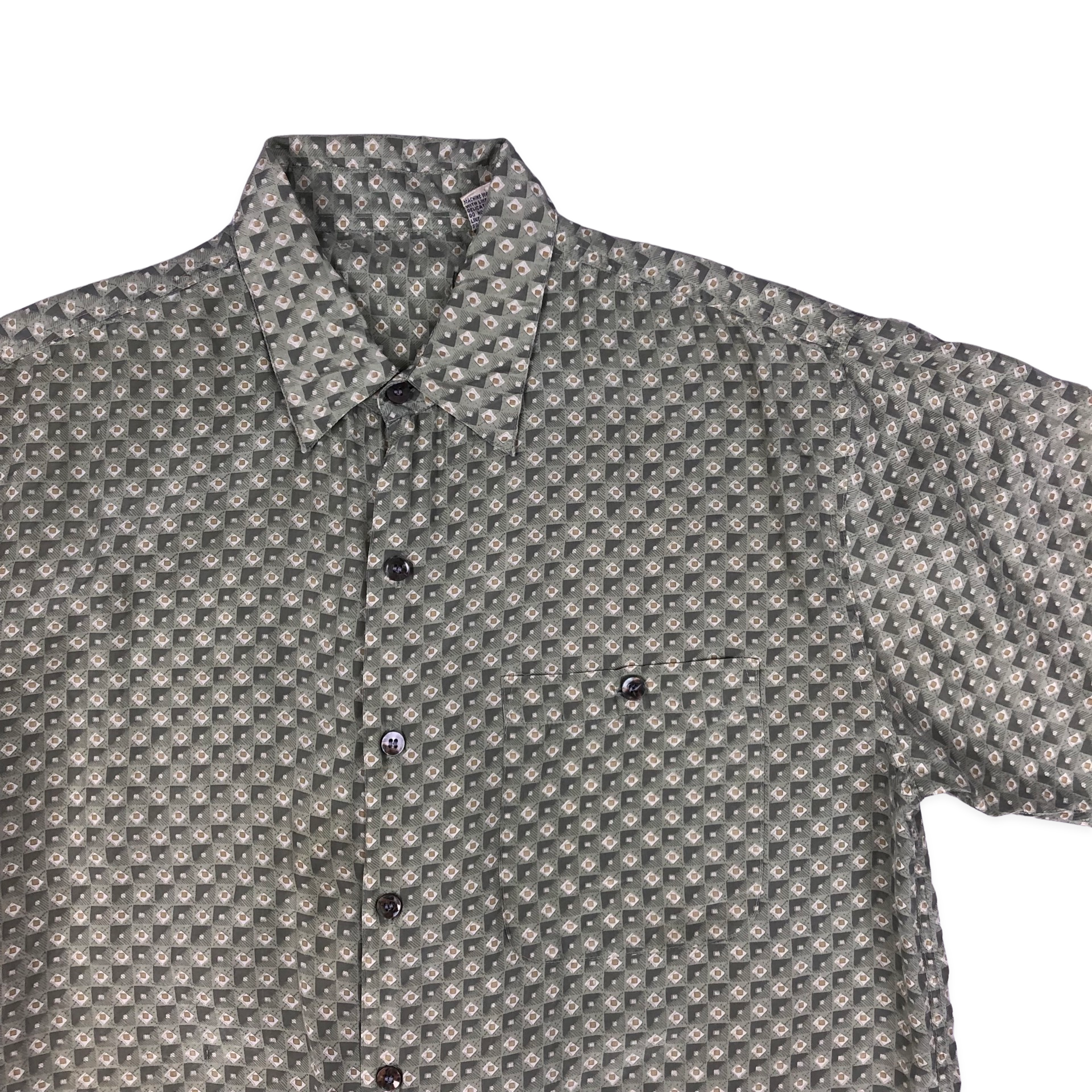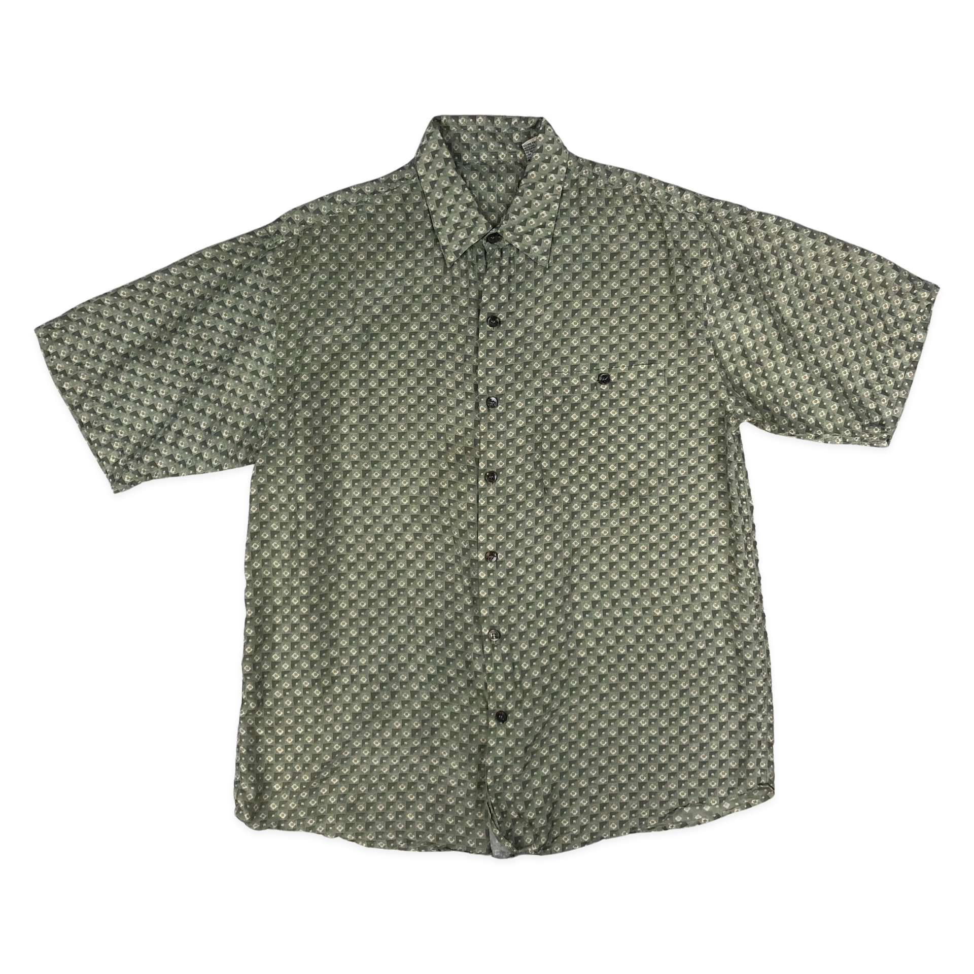 Vintage silk button-up pocket shirt in green with subtle geometric pattern print.