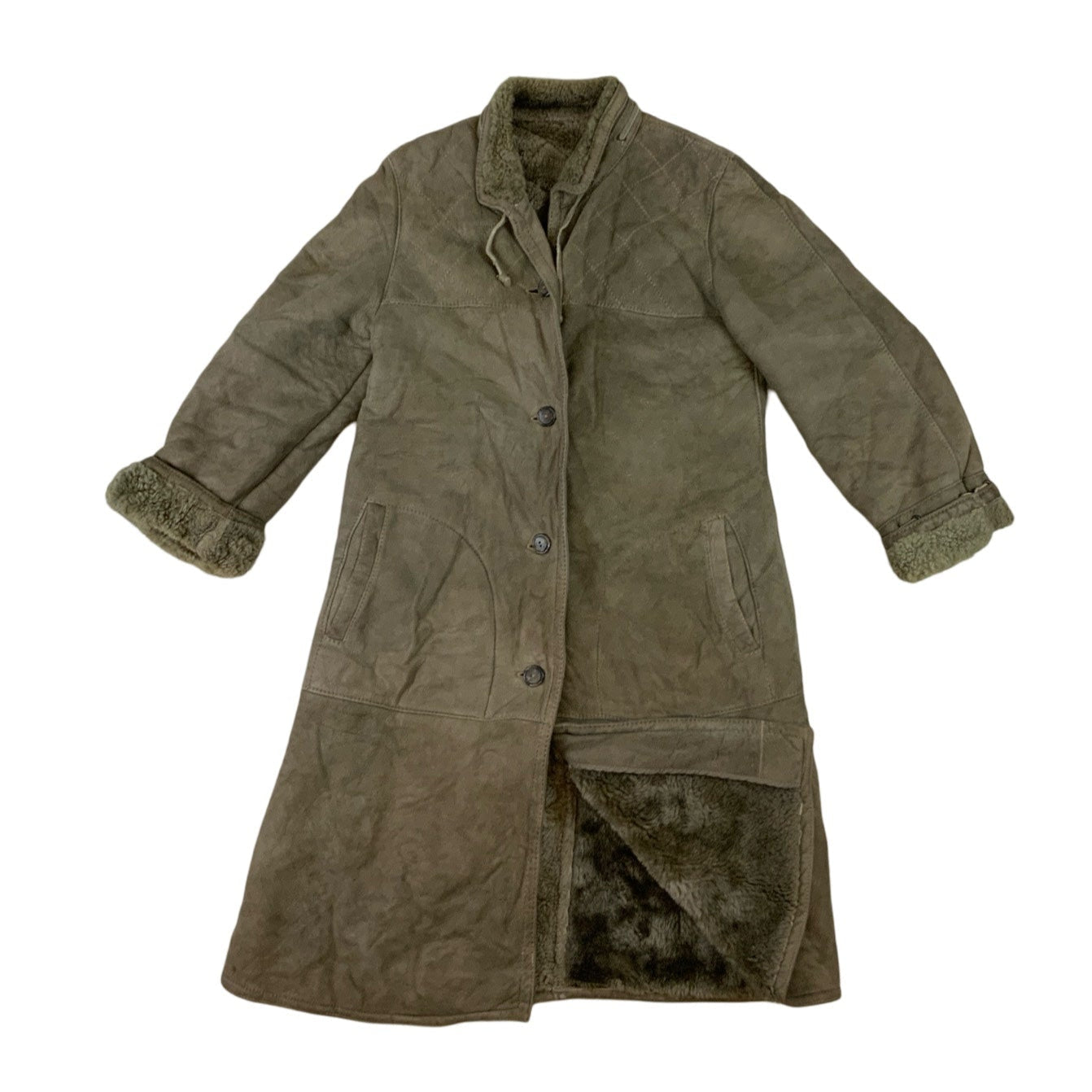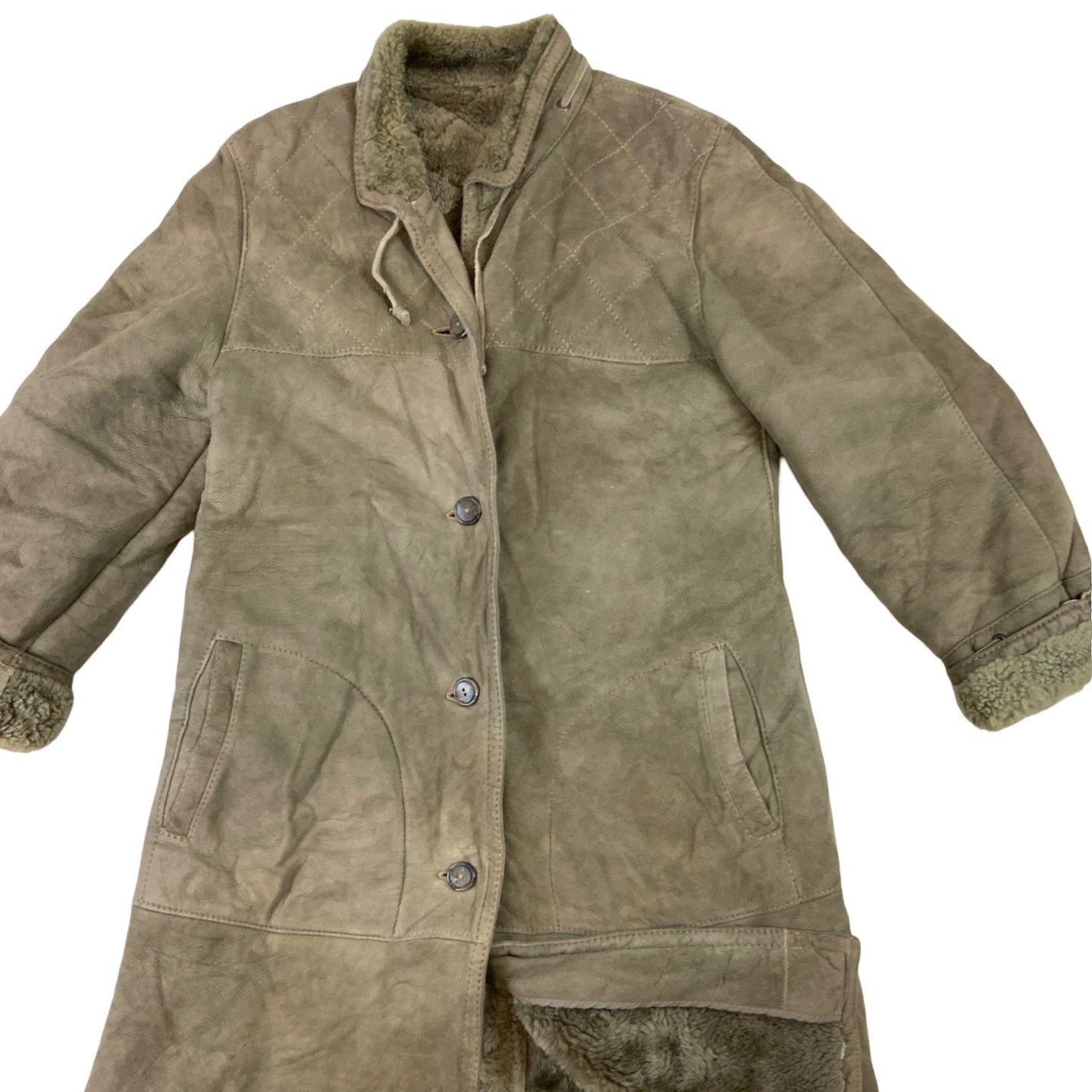 Vintage sheepskin/ faux suede shearling coat with faux fur collar. Light green with diamond stitch pattern on chest. Front pockets. Buttoned front fastening.