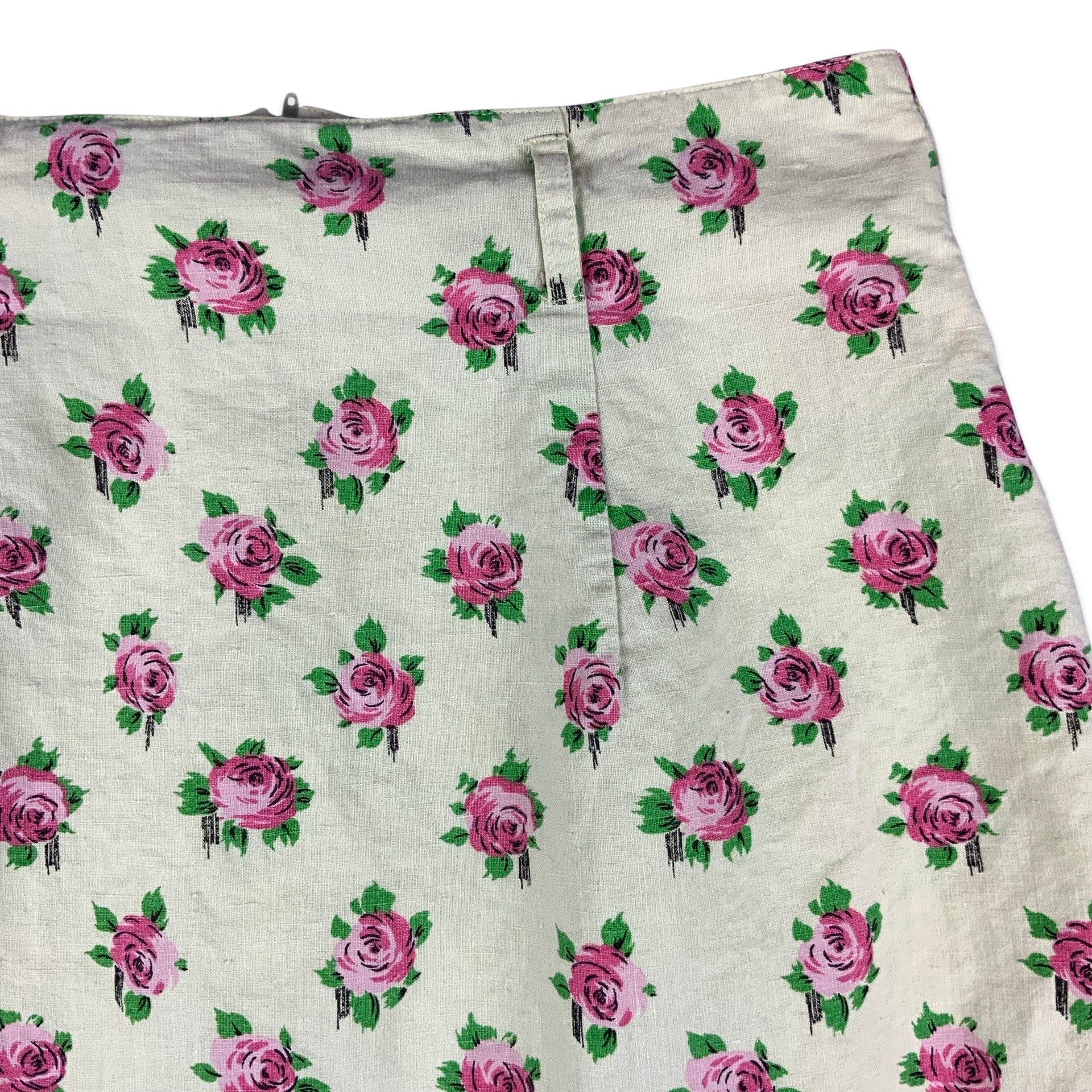 Vintage green and pink midi skirt with all-over rose print. Belt loops and zip fastening.