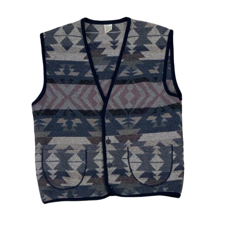 Vintage grey, blue and black aztek waistcoat with pockets. 60% wool, 20% nylon and 20% acrylic.