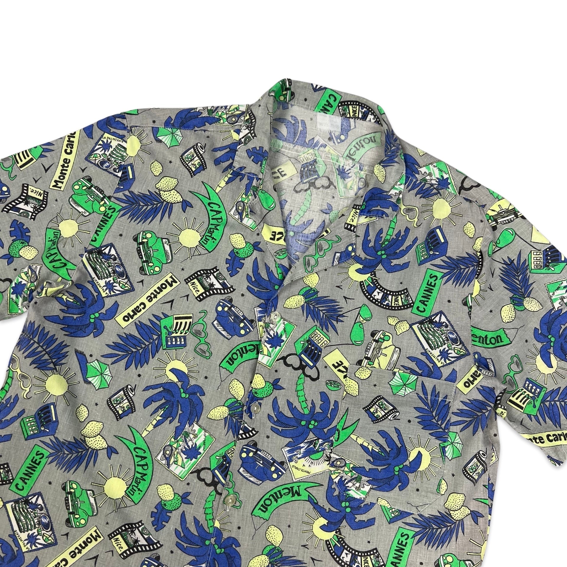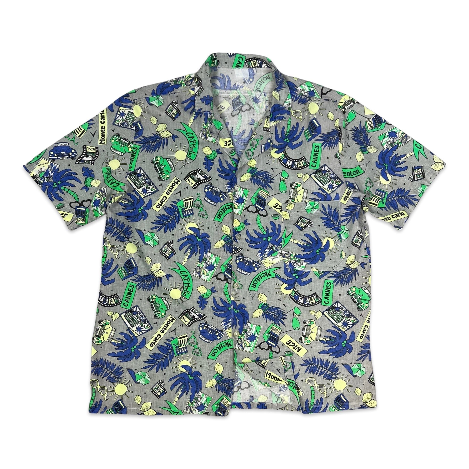 Vintage men's Hawaiian style shirt in grey, blue, and green with all-over beach theme abstract print and chest pocket.