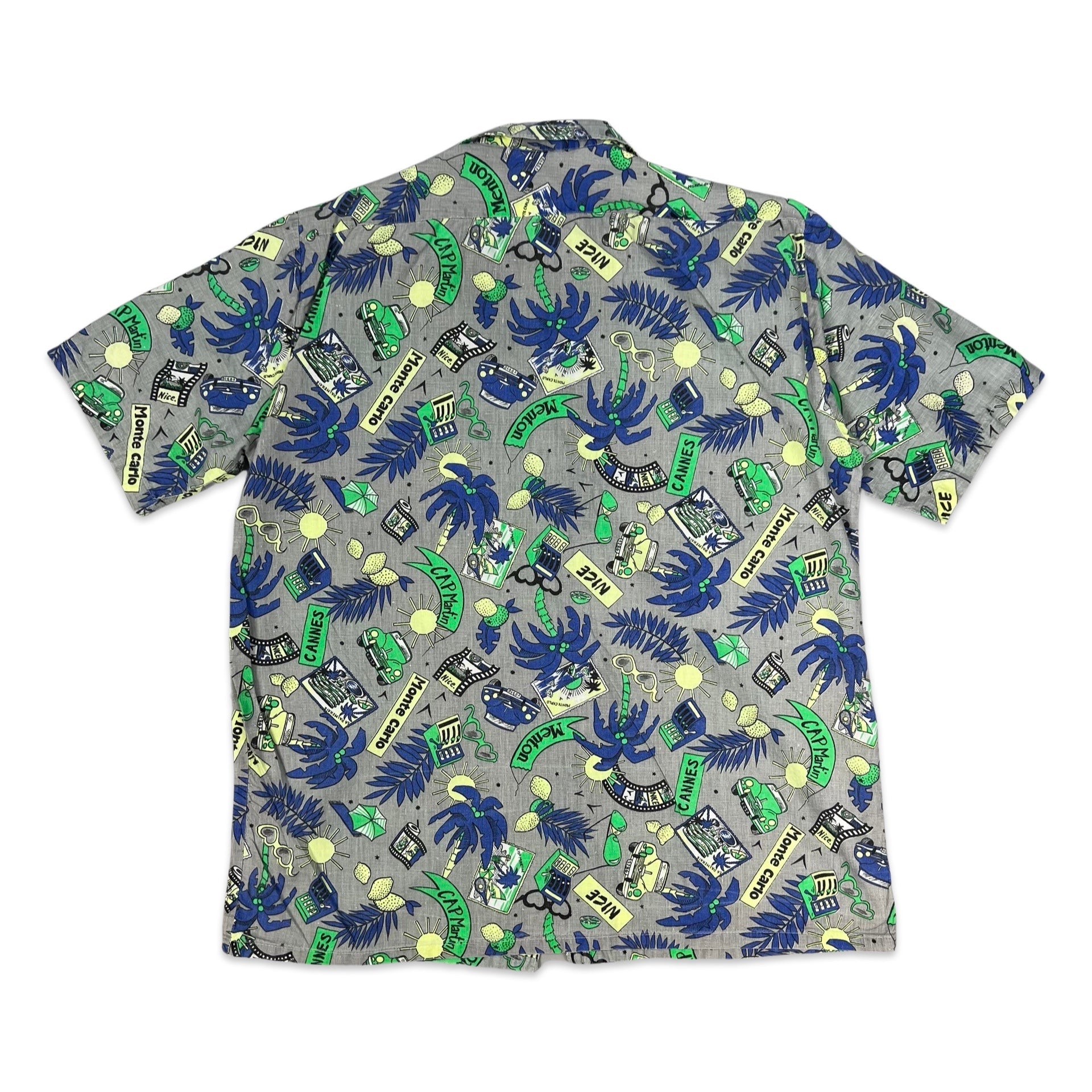 Vintage Grey Blue & Green Abstract Beach Theme Print Hawaiian Shirt S M
