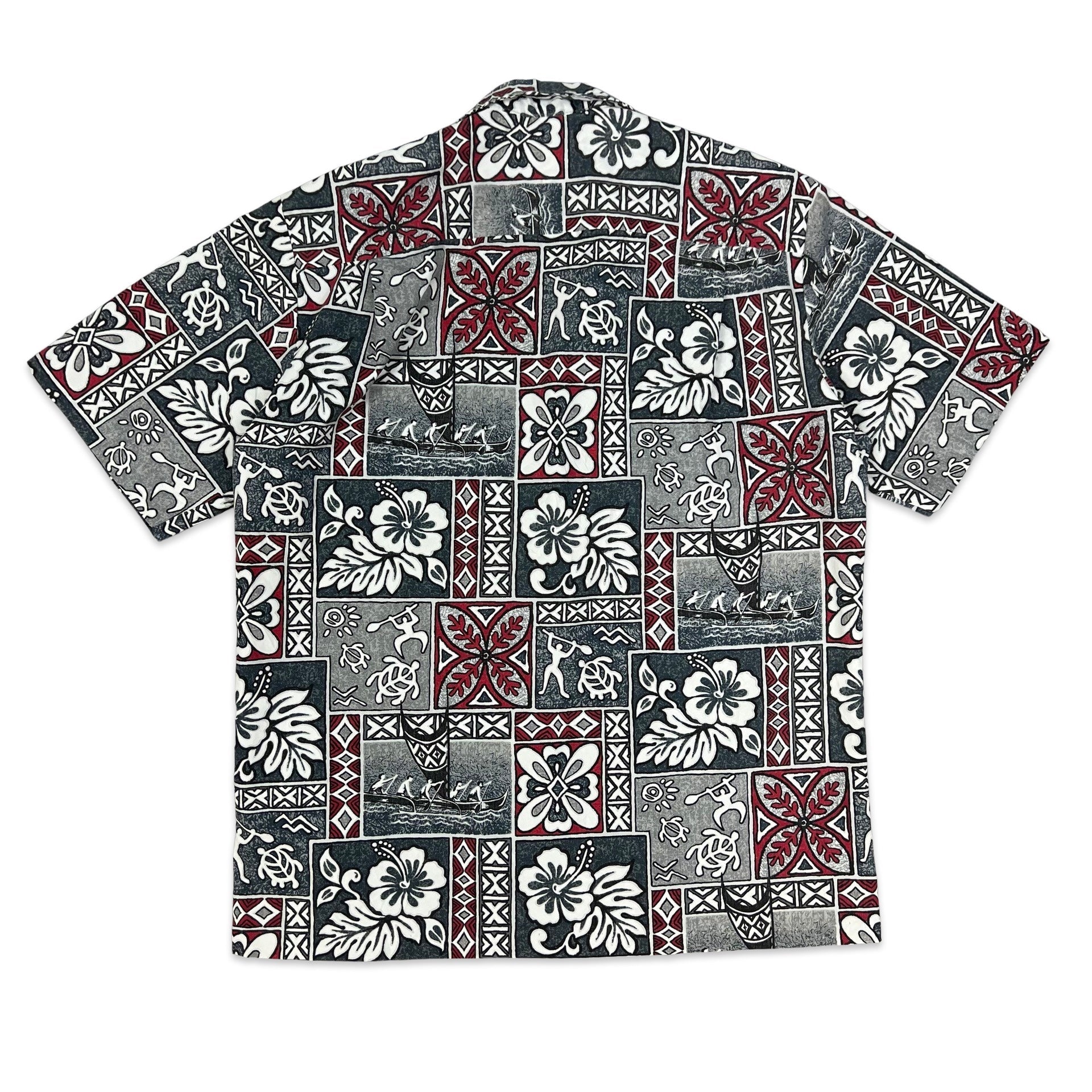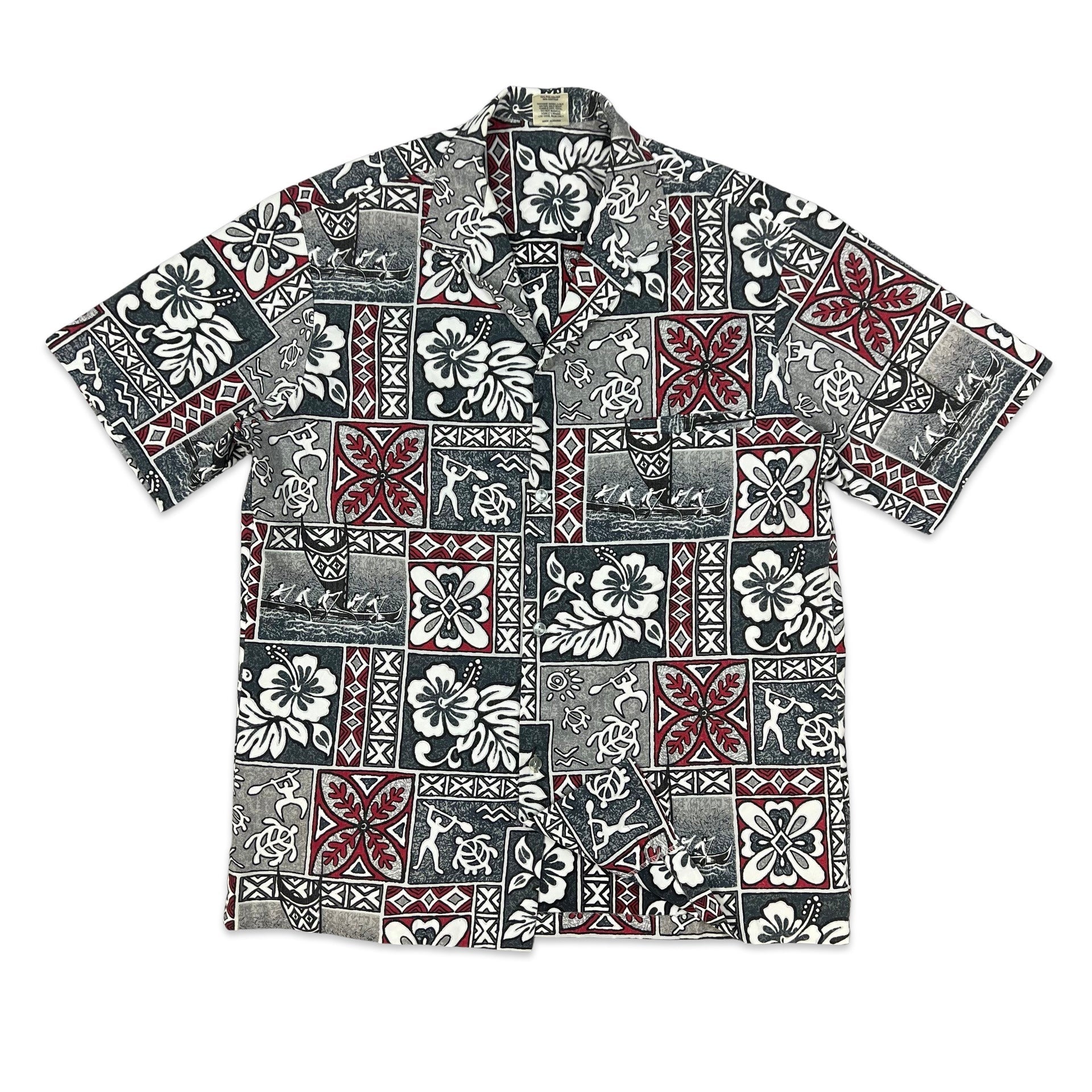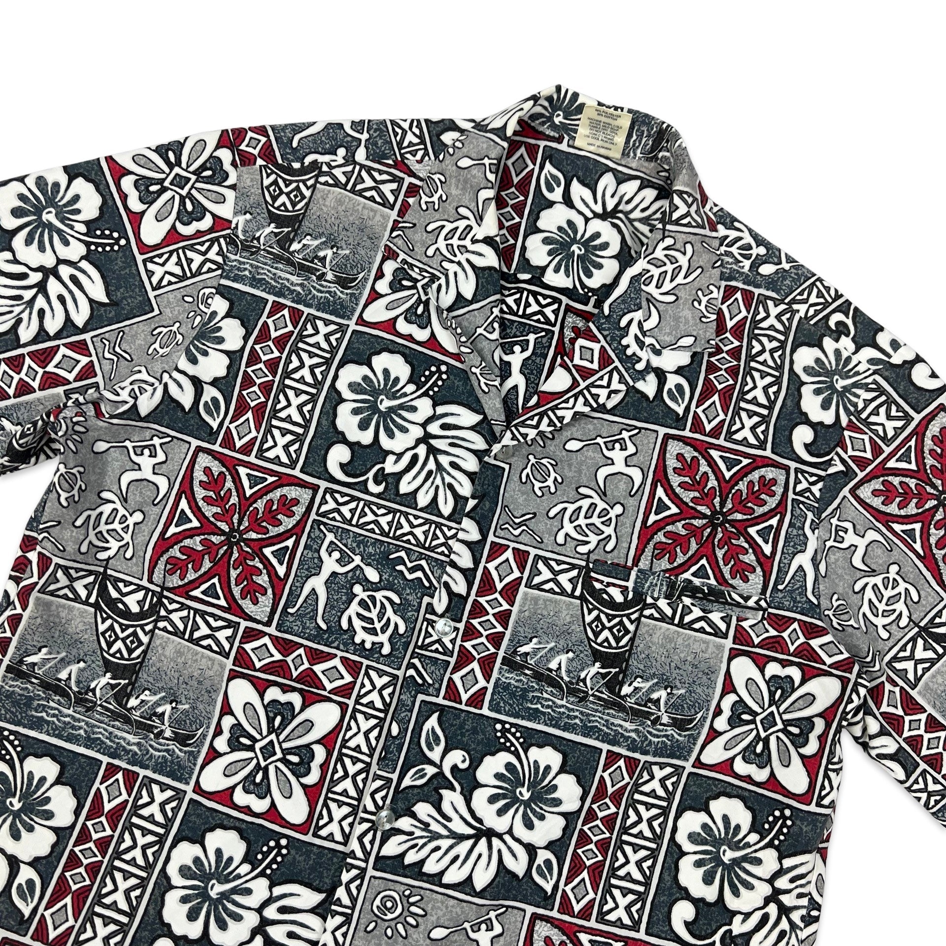 Vintage Grey & Red Made in Hawaii Abstract Print Hawaiian Shirt M L