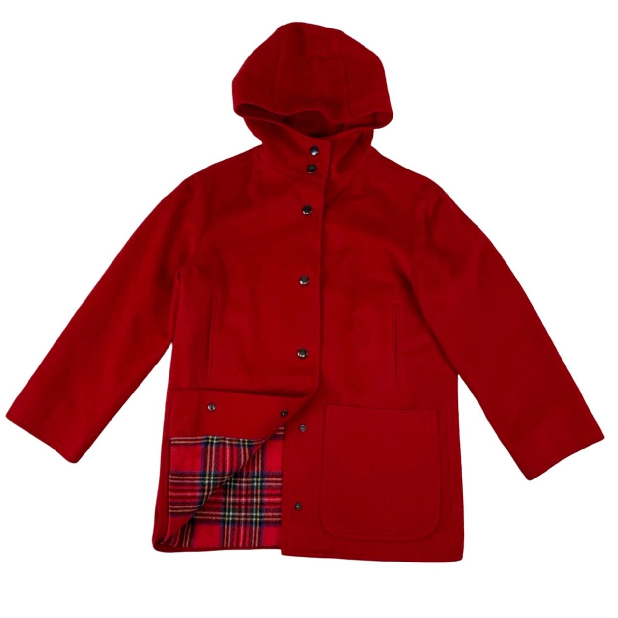 Vintage red hooded wool coat. Featuring two front pockets checkered interior lining front button up fastening. 100% wool.
